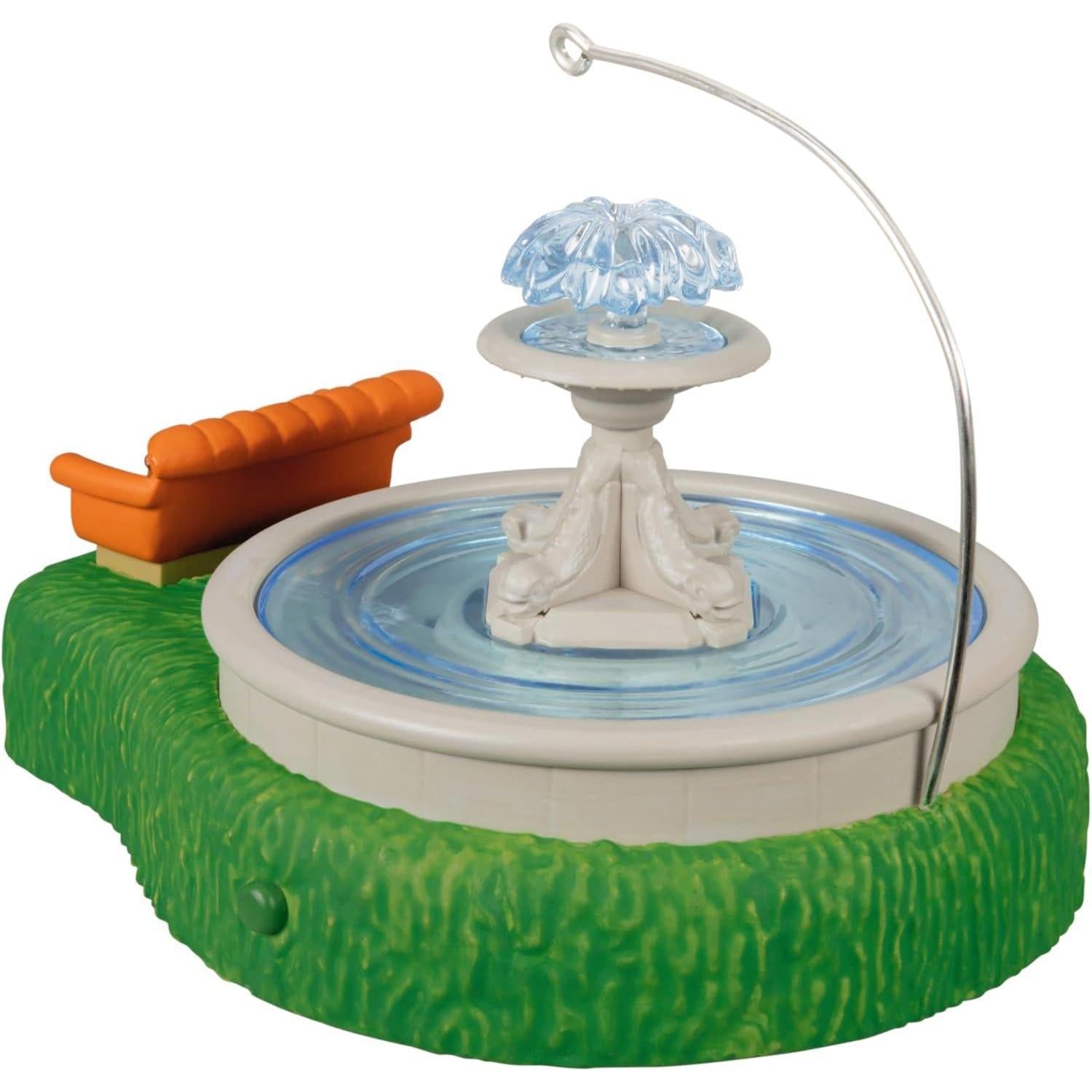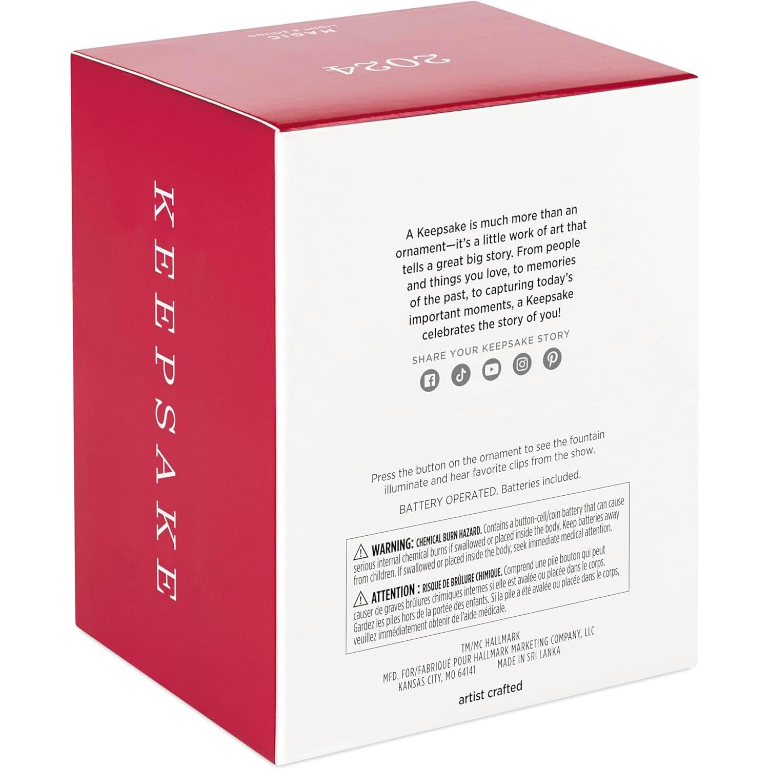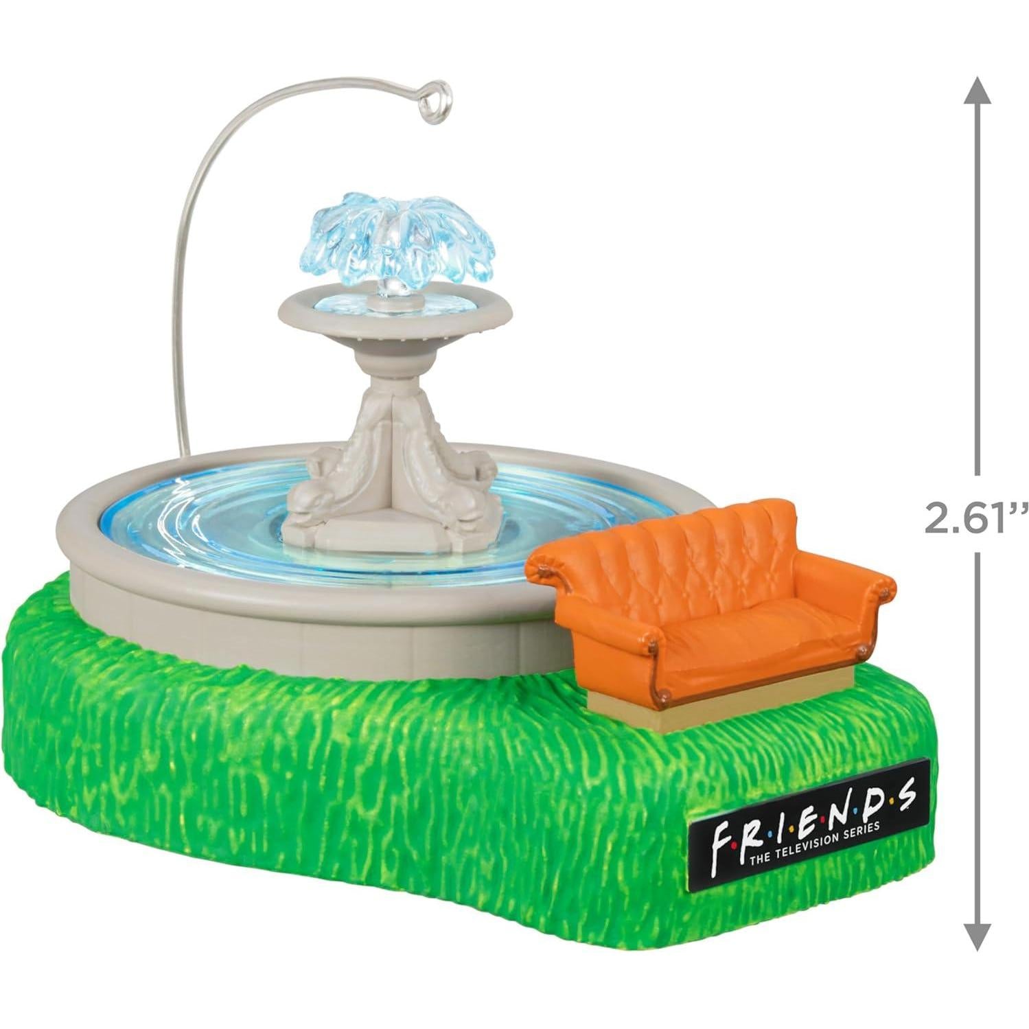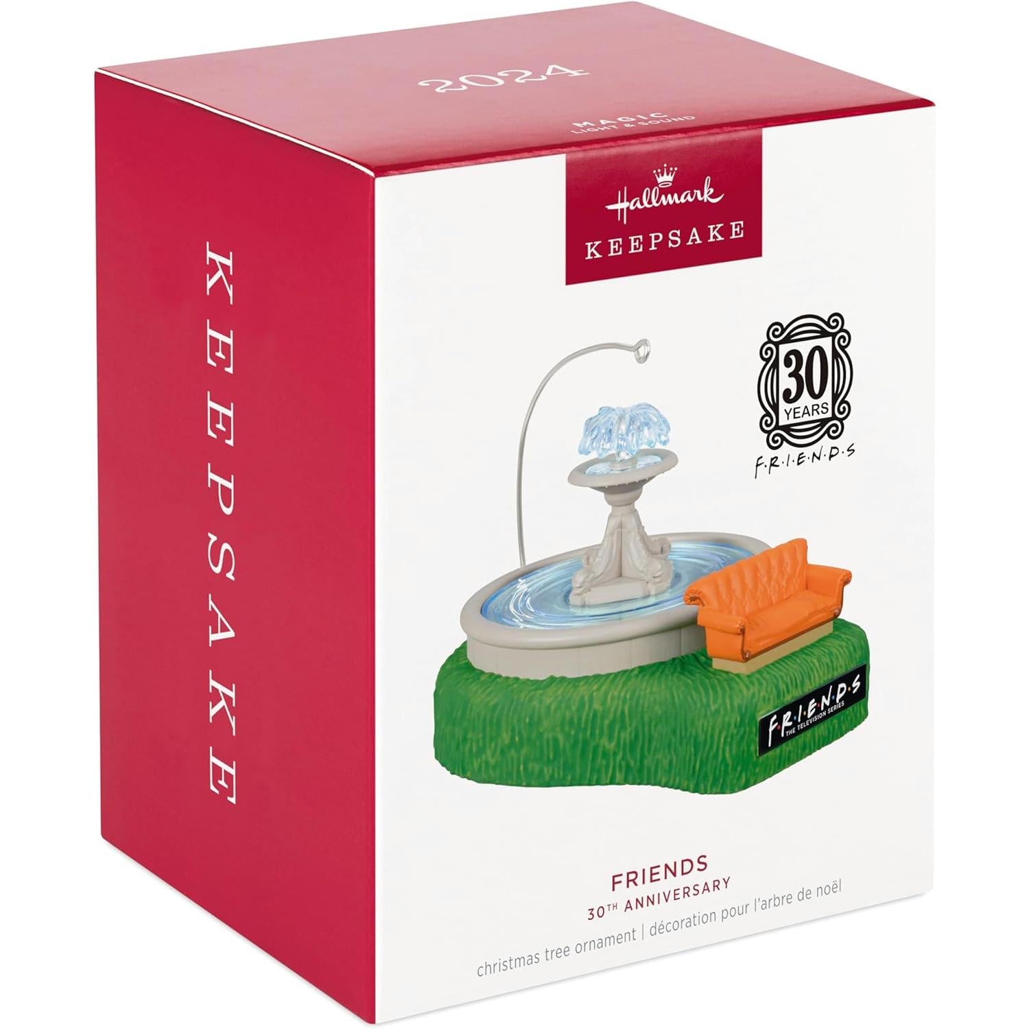 Celebrate three decades of laughter and camaraderie with the 2024 Friends 30th Anniversary Hallmark Keepsake Ornament. This special edition captures the iconic couch and fountain from the show's opening credits. Press the button to illuminate the fountain and hear memorable lines from Monica, Ross, Rachel, Chandler, Joey, and Phoebe. A must-have for any Friends fan, this ornament brings a touch of Central Perk to your holiday décor