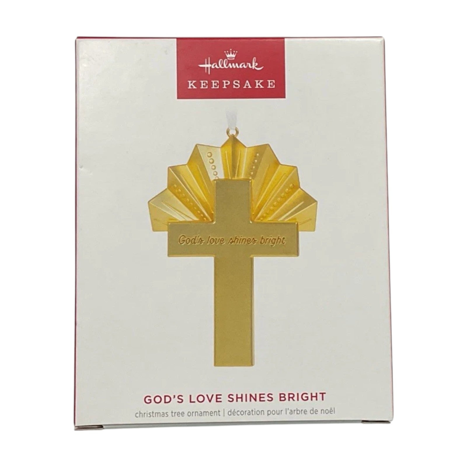 Celebrate the profound message of faith with the 2024 God's Love Shines Bright ornament. This elegant piece features a metal cross adorned with a radiant sunburst design, finished in a shimmering metallic gold. The ornament bears the heartfelt inscription "God's love shines bright," serving as a beautiful reminder of spiritual devotion. Designed by artist Terri Steiger, it comes in its original Hallmark Keepsake box, making it a meaningful gift or a cherished addition to your own collection.