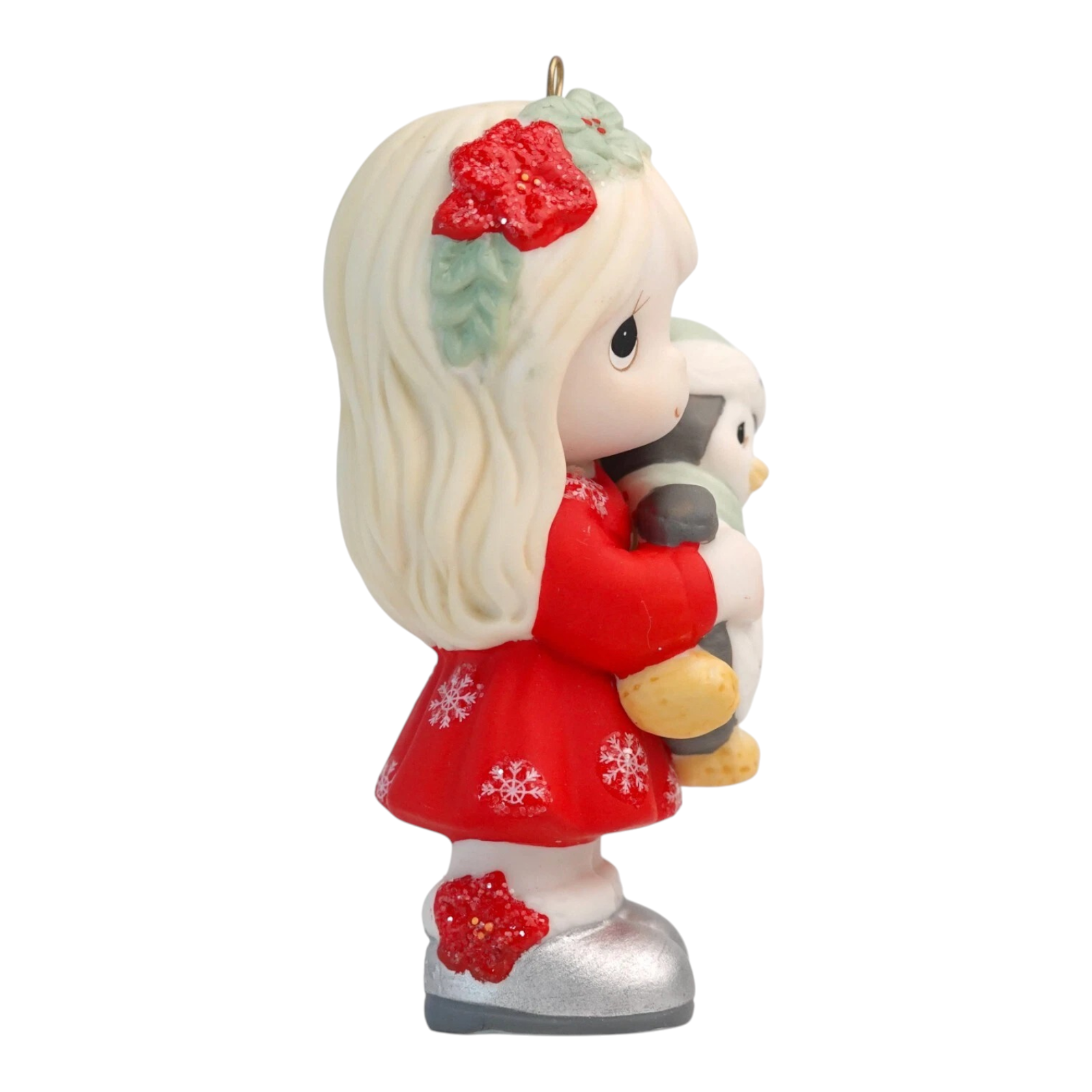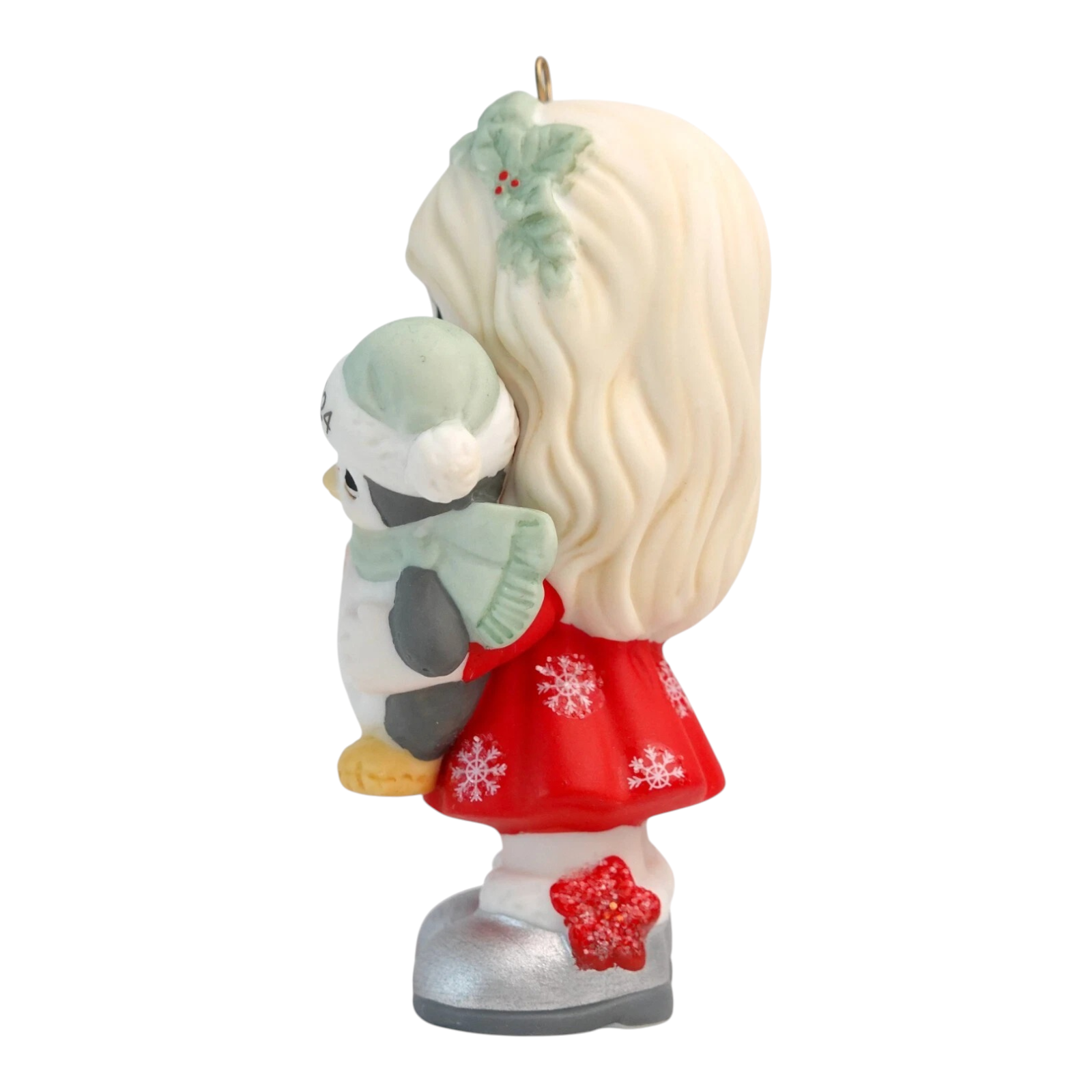 Celebrate a memorable 2024 with this endearing ornament featuring a sweet-faced girl in a festive red dress adorned with white snowflakes, joyfully hugging her bundled-up penguin friend (wearing a scarf and hat marked “2024”). Crafted in fine bisque porcelain and hand-painted with delicate detailing, this piece evokes warmth, milestone moments and holiday cheer. Whether gifted to mark a special year or added to your seasonal collection, this ornament captures the spirit of “making memories” while embodying the signature Precious Moments charm.