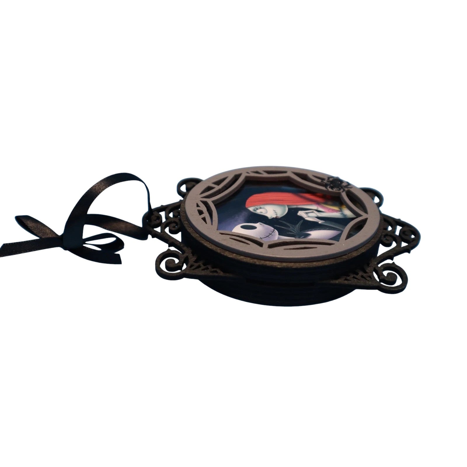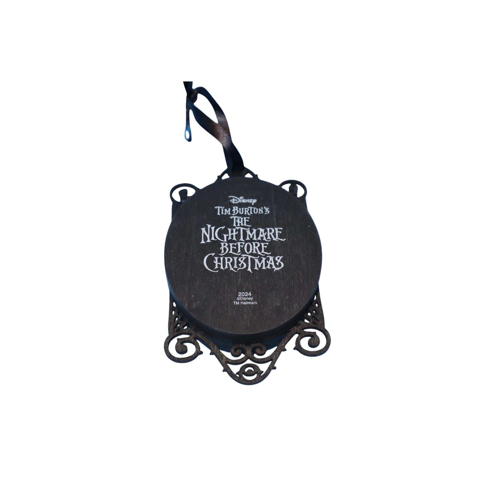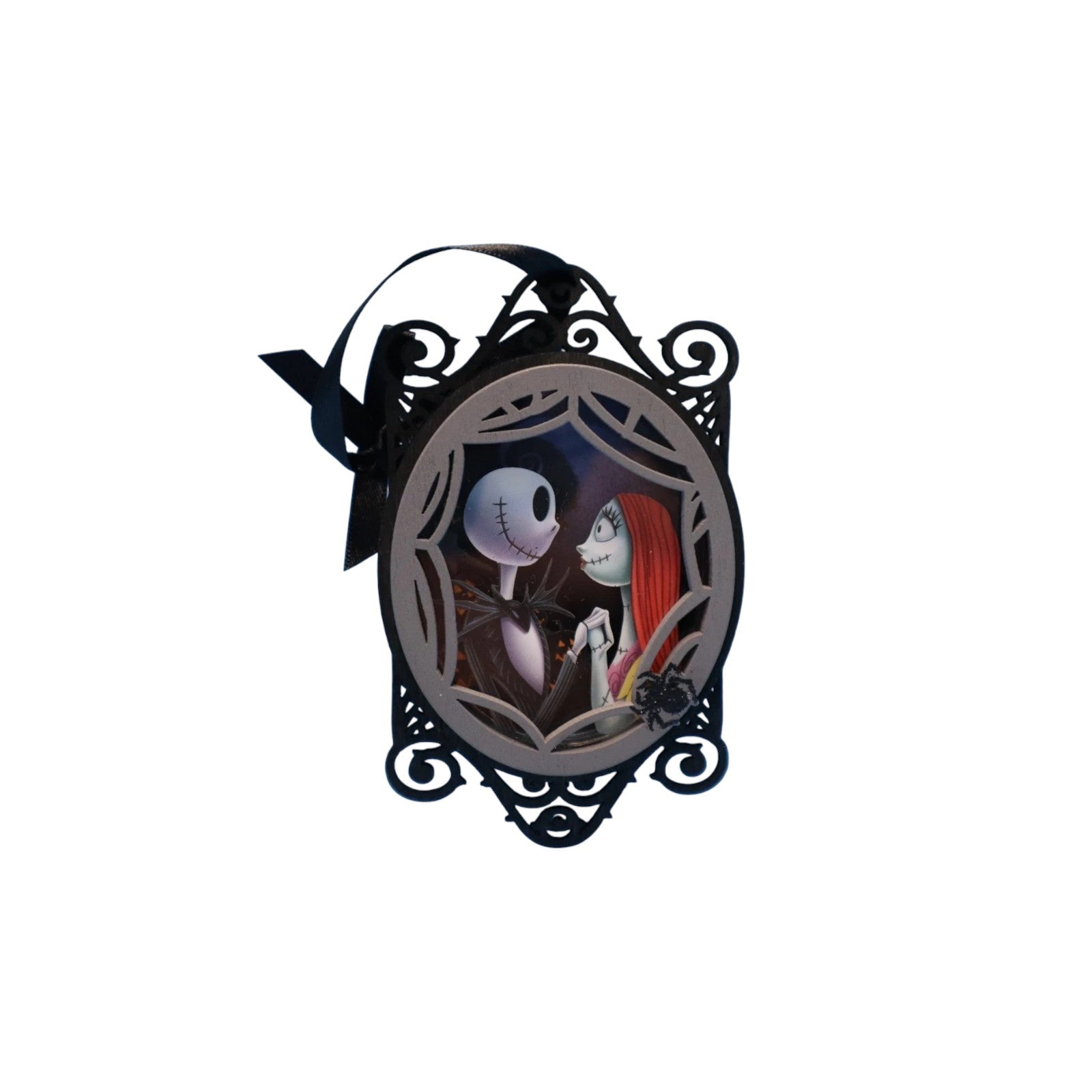 Embrace love from Halloween Town with the 2024 Jack and Sally (The Nightmare Before Christmas) ornament. Designed by Gregor Benedetti, this keepsake features Jack and Sally sharing a tender moment inside a laser-cut wood and paper frame, accented by a glittery spider. Crafted with paper, wood, and plastic, this 4.6″ × 2.8″ ornament arrives fully assembled and ready to hang—no batteries or cords needed. Released at the July 2024 Premiere event, this charming papercraft piece brings nostalgic romance to any holiday décor.