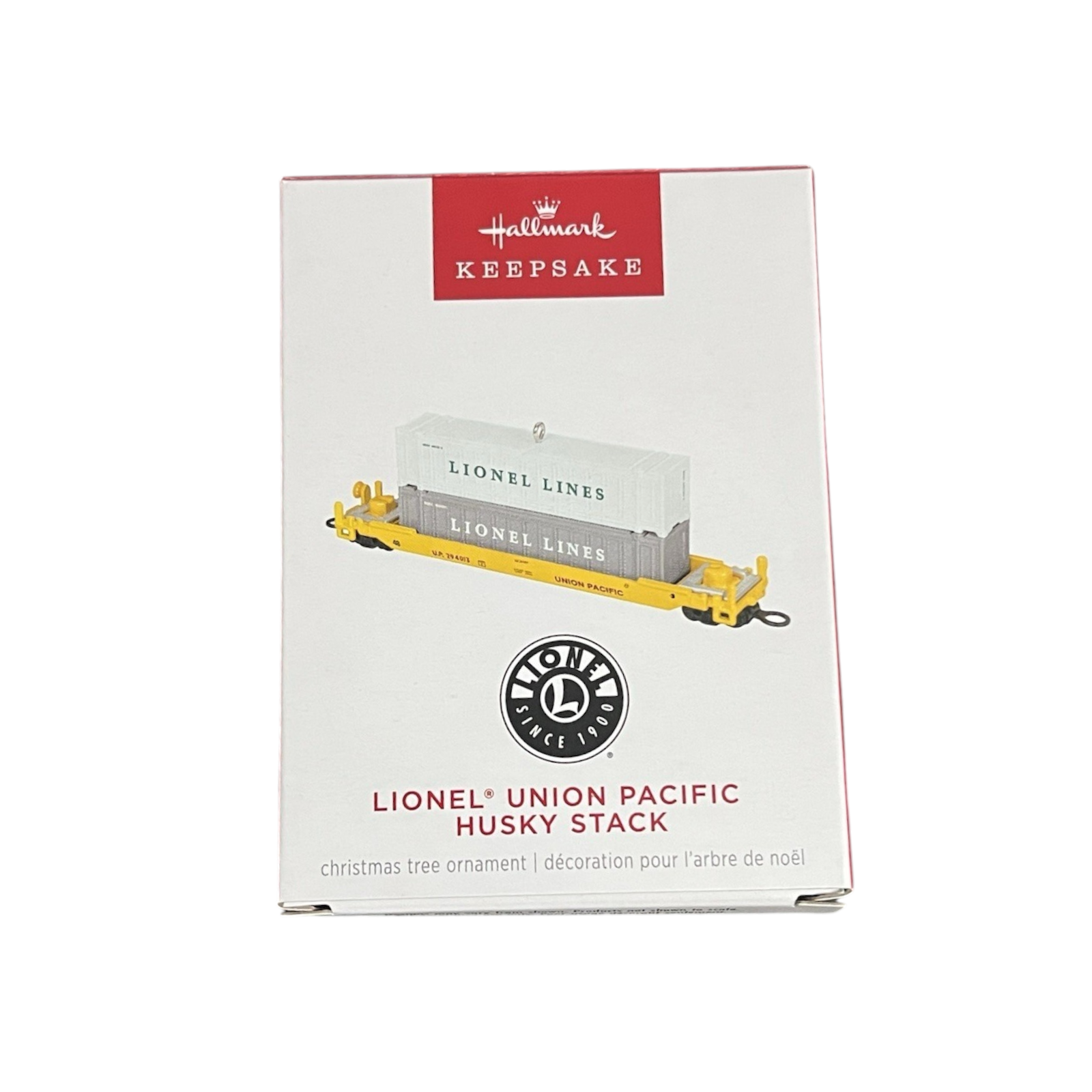The 2024 LIONEL Union Pacific Husky Stack – QXI7014 Hallmark Keepsake ornament is a finely crafted homage to heavy freight rail—a perfect companion piece to this year’s Union Pacific Legacy SD70ACe engine ornament. The design features a die-cast metal well car loaded with distinctive “Lionel Lines” shipping containers, detailed Union Pacific markings, and functioning wheels for added realism. With its bright yellow-and-grey color scheme, steel-rail finishes and small but vivid detailing, it’s a must-have for train enthusiasts, model railroad collectors and holiday décor fans alike.