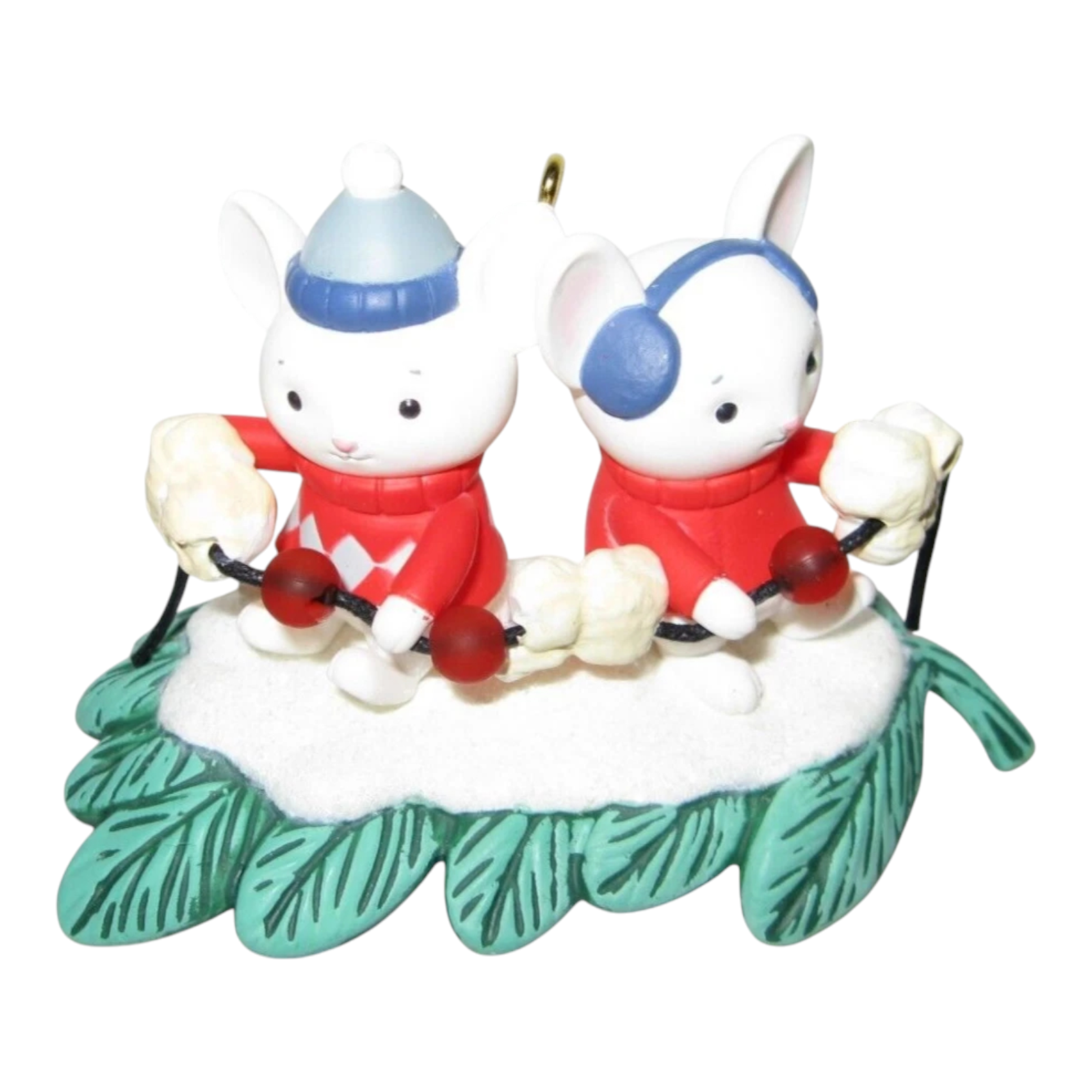 Celebrate holiday decorating traditions with the 2024 Merry Mice Hallmark Keepsake Ornament. This charming ornament features two festive mice in red sweaters perched on a snow-covered branch, stringing a garland of popcorn and cranberries. Crafted from durable plastic and designed by artist Gregor Benedetti, this piece captures the joy and warmth of the season. It comes packaged in its original Hallmark Keepsake gift box, making it a delightful addition to your holiday décor or a perfect gift for collectors and animal lovers. No batteries or cords are required—simply hang and enjoy this adorable ornament.