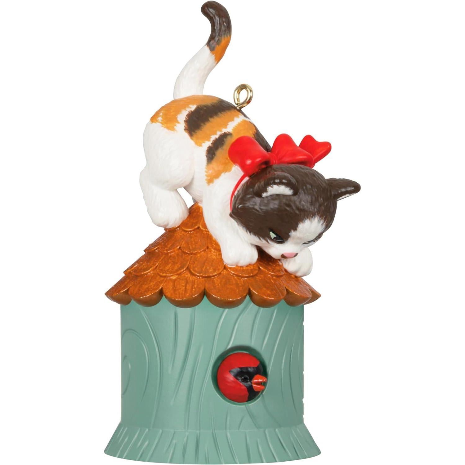 Celebrate the playful spirit of the season with the 2024 Mischievous Kittens Hallmark Keepsake Ornament. This 26th installment in the beloved series features a curious calico kitten perched atop a birdhouse, ready to surprise a red cardinal peeking out of its cozy home. Crafted from durable plastic and designed by artist Nina Aubé, this ornament captures the endearing antics of kittens during the holidays. Packaged in its original Hallmark Keepsake gift box, it's perfect for gifting or adding to your own festive collection. No batteries or cords are required—simply hang and enjoy this charming addition to your tree.