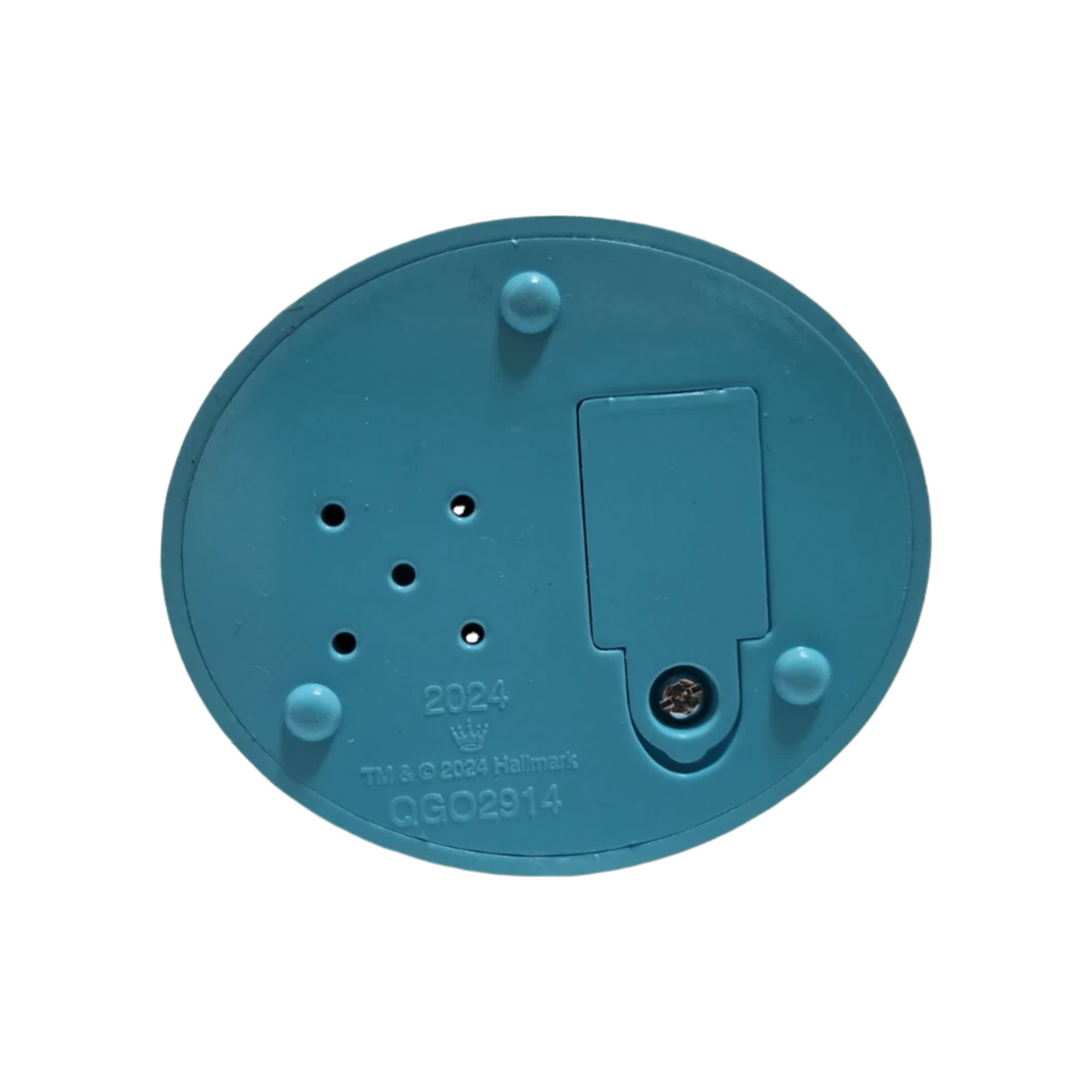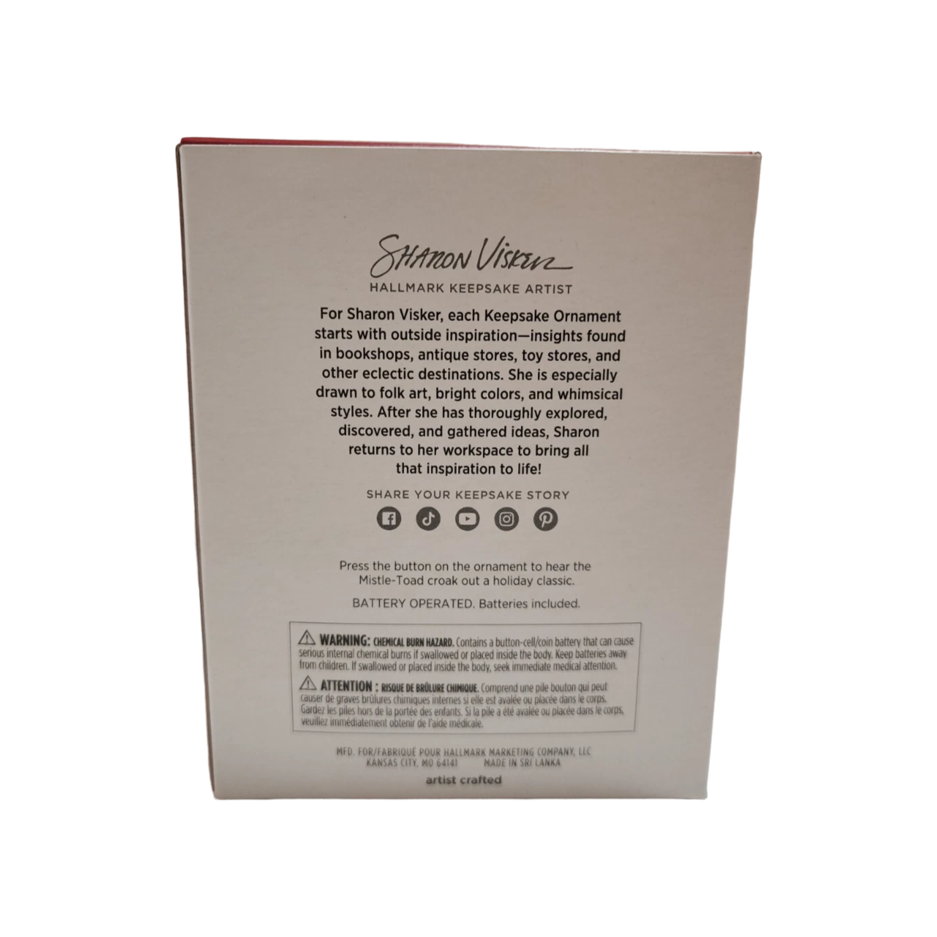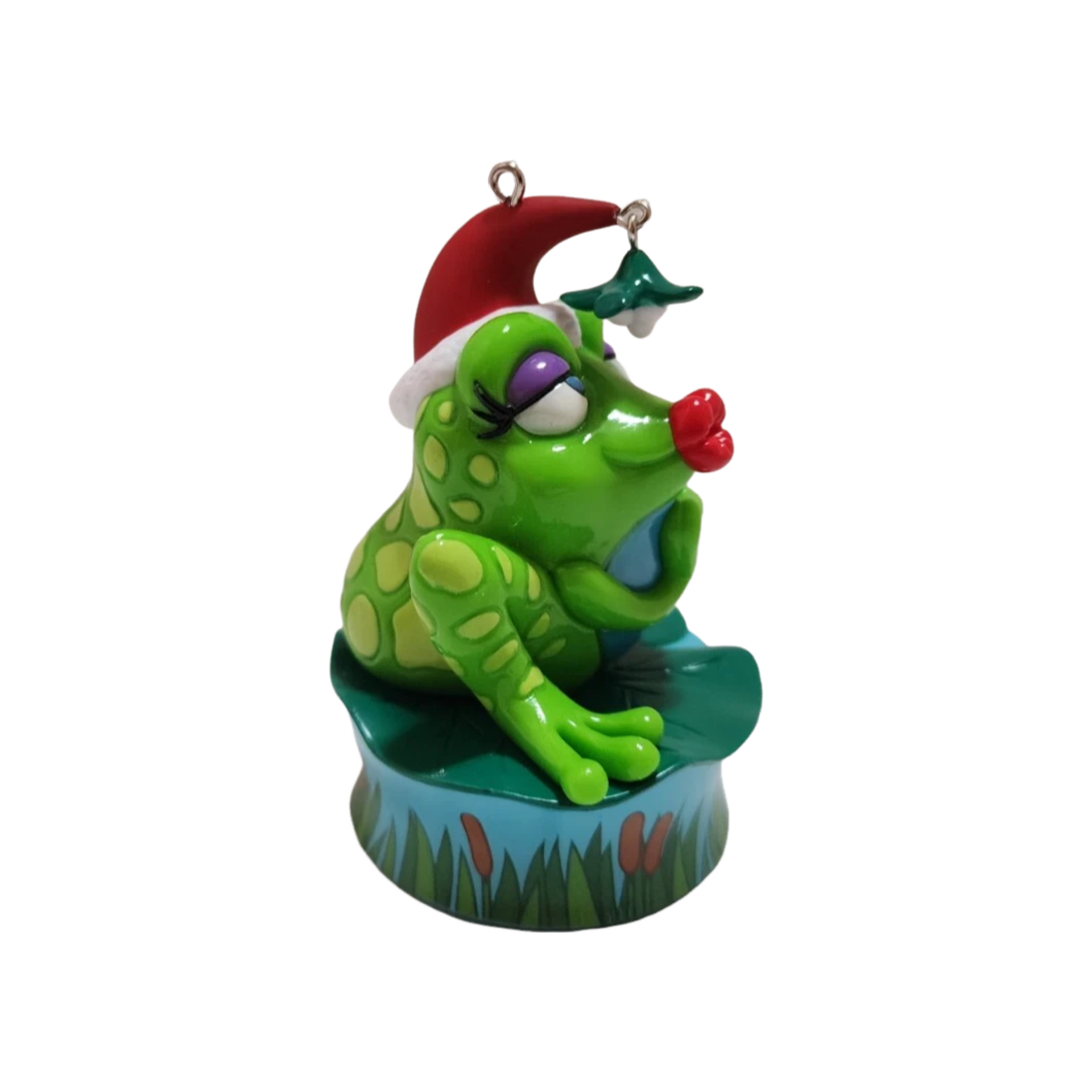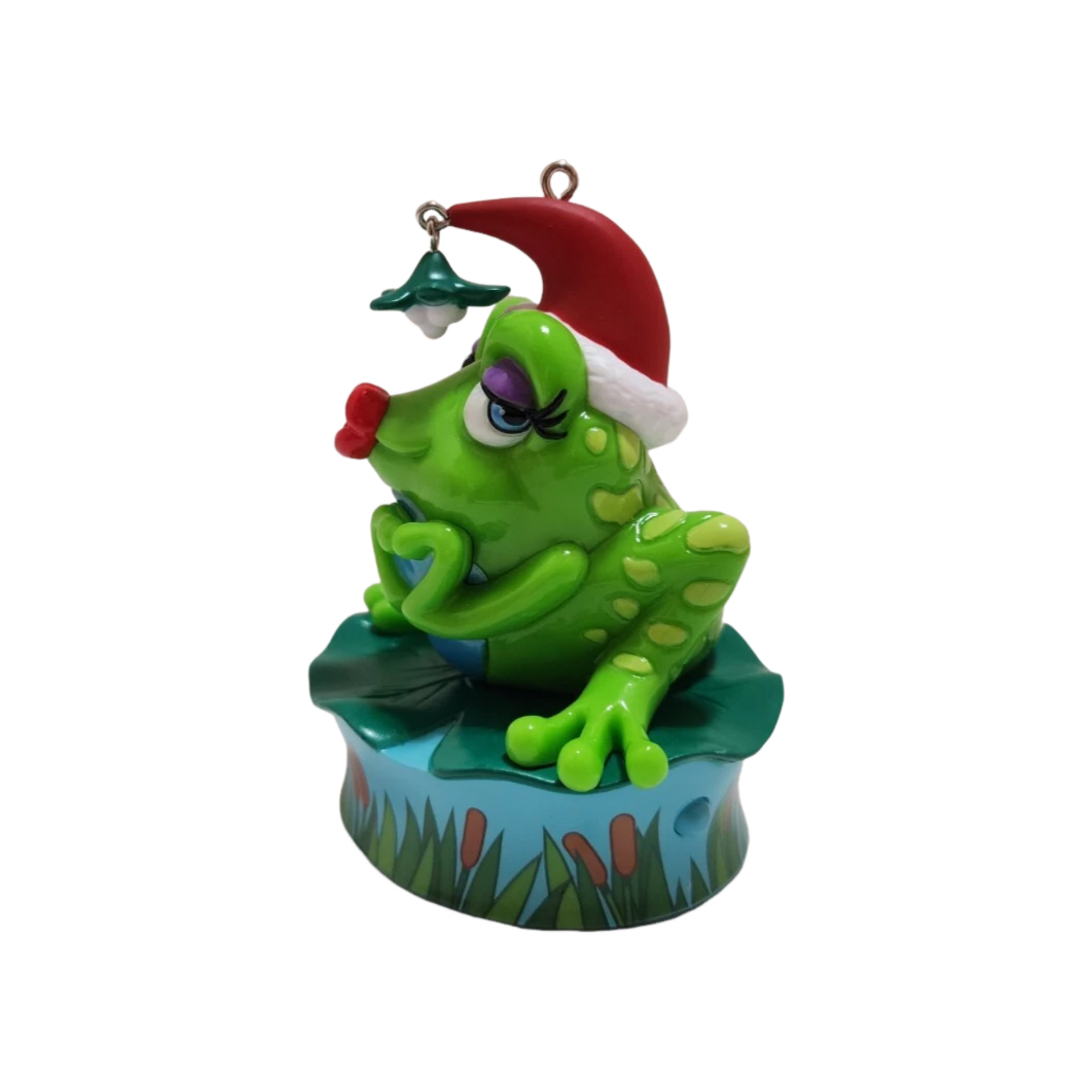 This adorable 2024 ornament features a cheerful green frog sitting atop a lily pad, wearing a festive Santa hat and holding a sprig of mistletoe overhead. His bright smile, glossy finish, and holiday charm make him a fun and whimsical addition to any Christmas tree—perfect for collectors who love animal ornaments or pun-themed holiday designs. The ornament comes in its original Hallmark box and requires no batteries, cords, or power accessories.
