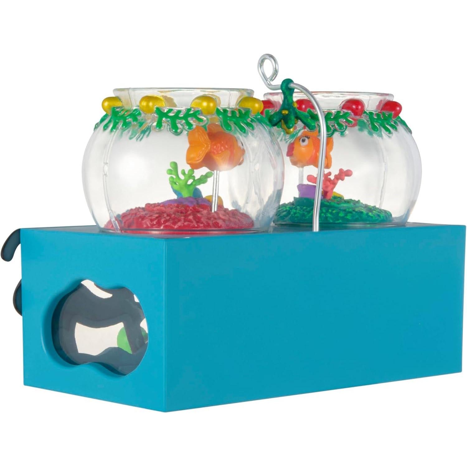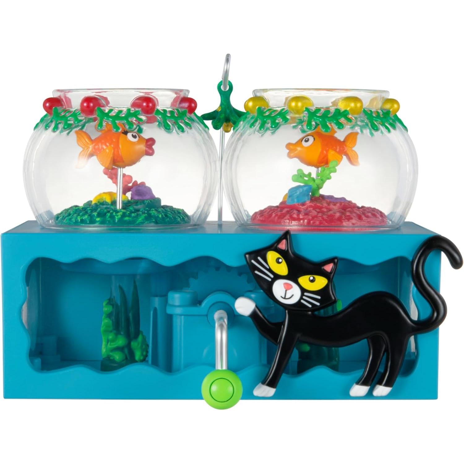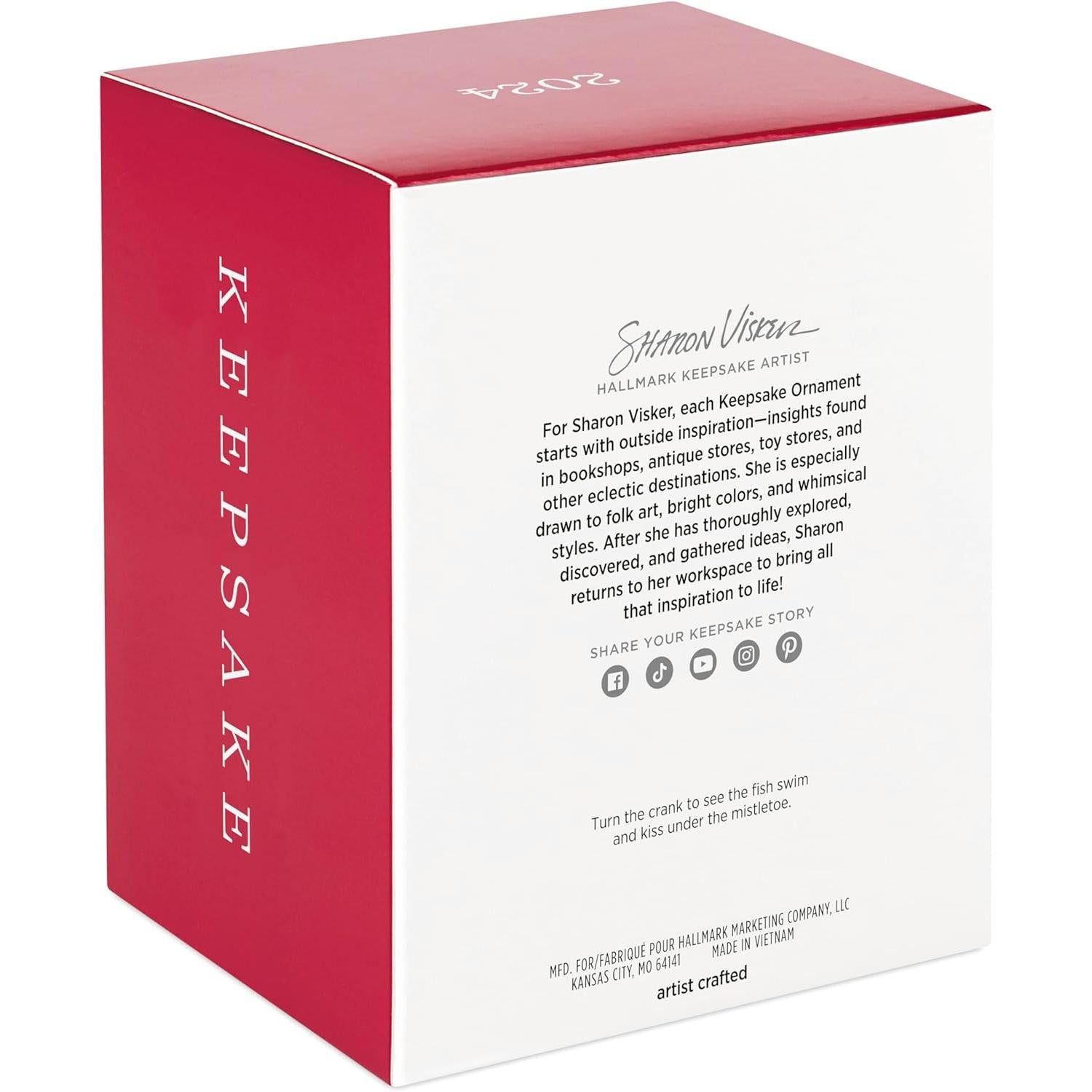 Add a splash of whimsy to your holiday décor with the 2024 Mistletoe Fishmas Hallmark Keepsake Ornament. This delightful ornament features two goldfish in separate bowls who swim around and share a kiss under the mistletoe when you turn the crank. Below them, a curious black-and-white kitten watches intently, ready to pounce on the playful scene. Crafted from durable plastic and designed by artist Sharon Visker, this ornament comes packaged in its original Hallmark Keepsake gift box, making it a perfect addition to your collection or a charming gift for animal lovers