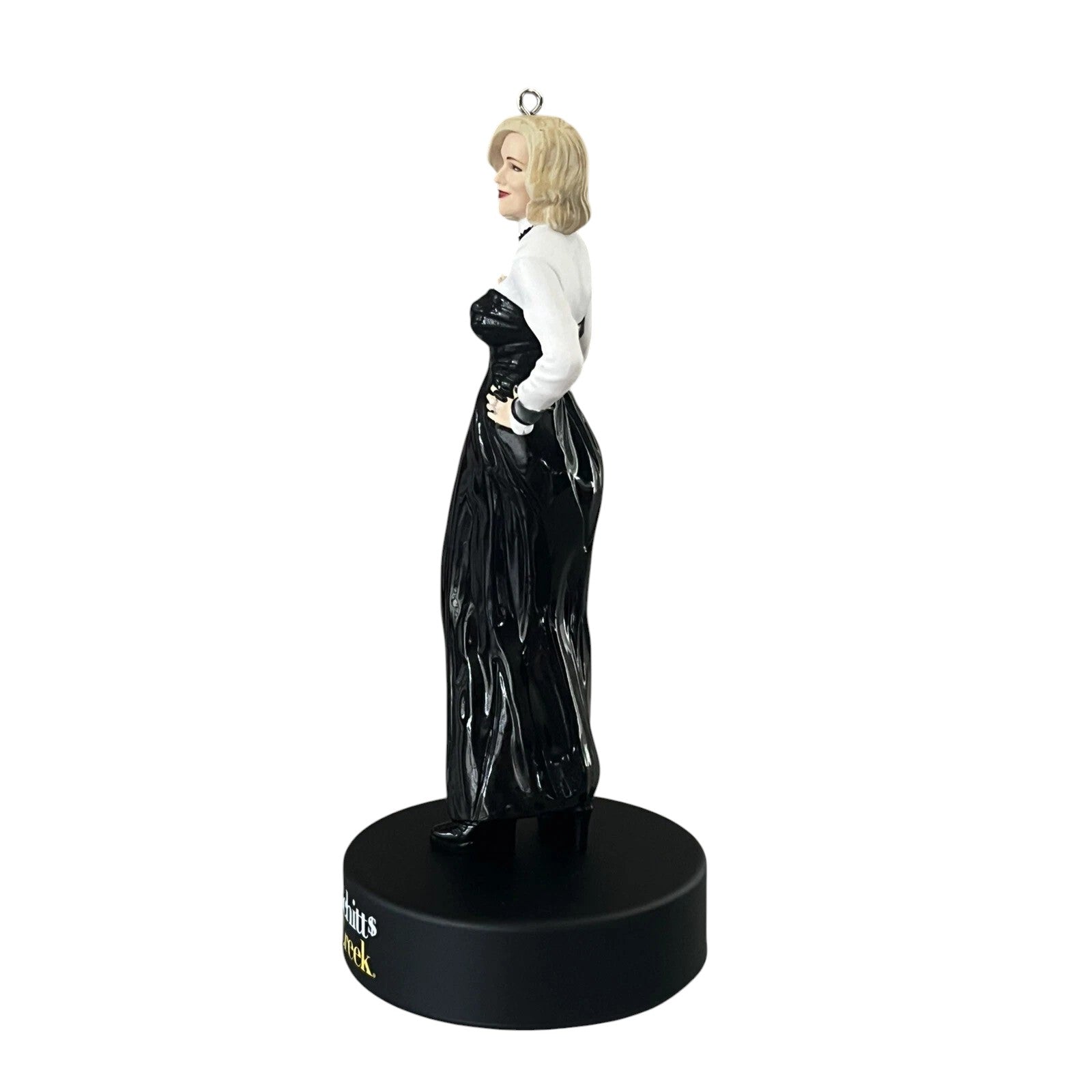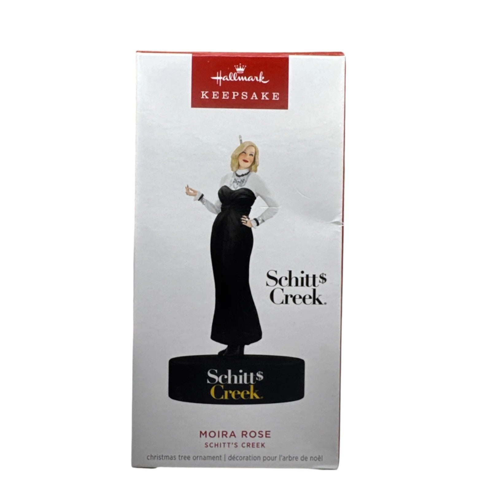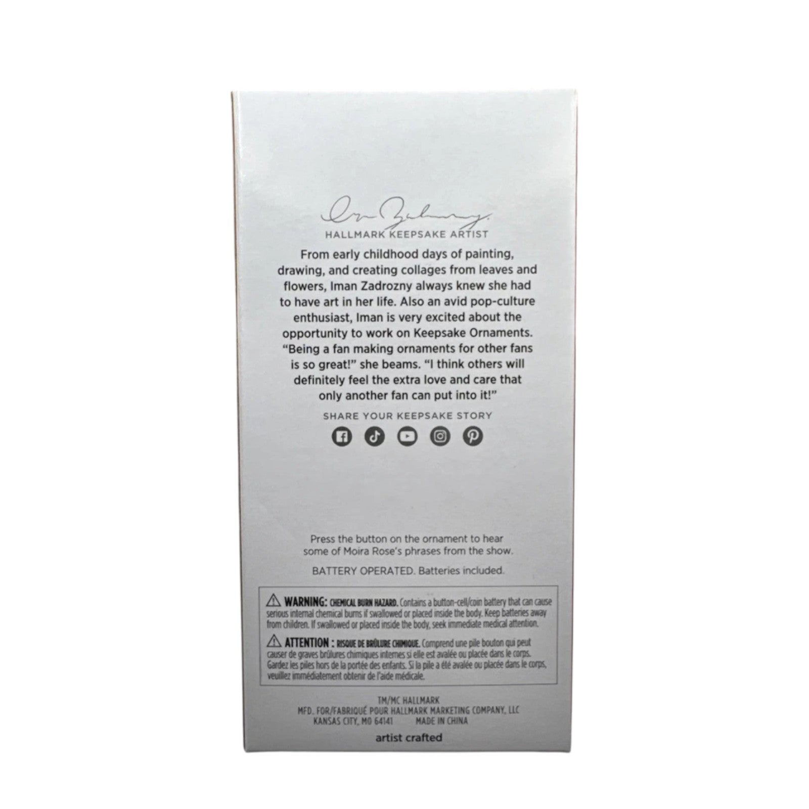 Celebrate the iconic Moira Rose from Schitt's Creek with this 2024 Hallmark Keepsake Ornament. Dressed in her signature black and white ensemble adorned with extravagant jewelry, Moira exudes her unparalleled flair. Press the button to hear some of her most memorable lines from the show, capturing her unique charm and wit. Crafted from durable plastic and designed by artist Iman Zadrozny, this ornament comes packaged in its original Hallmark Keepsake gift box, making it a perfect addition to your holiday décor or a thoughtful gift for fans of the series.