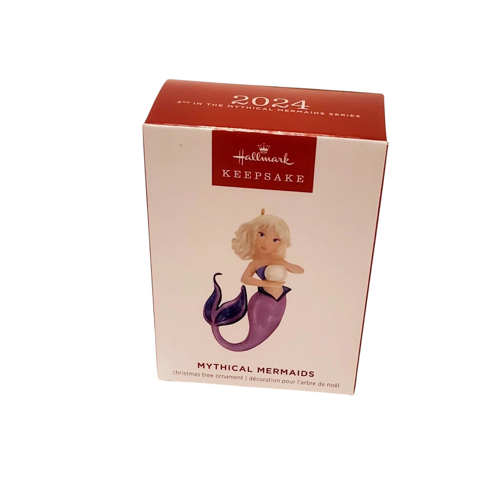 Dive into enchantment with the 2024 Mythical Mermaids #2 Hallmark Keepsake Ornament. This captivating piece features "Violet," a blonde mermaid adorned with an iridescent purple and blue tail, gracefully holding a gleaming pearl. Artistically crafted by Kristina Gaughran, this ornament is the second in the Mythical Mermaids series, bringing a touch of oceanic magic to your holiday décor. Packaged in its original Hallmark Keepsake gift box, it's perfect for gifting or adding to your own collection. No batteries or cords are required—simply hang and let the mermaid's charm enhance your festive ambiance