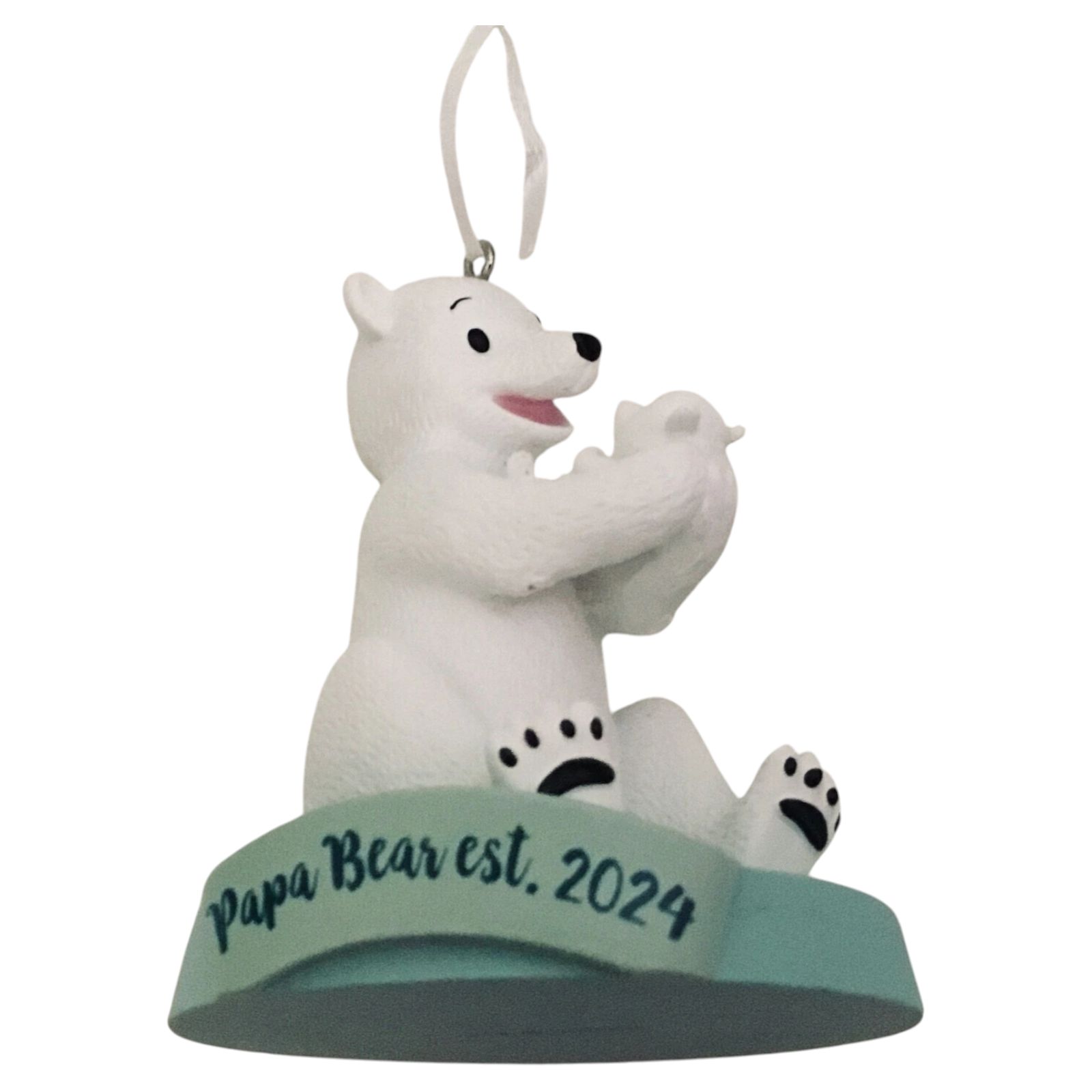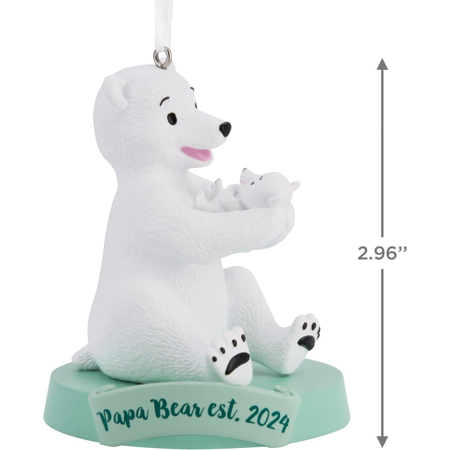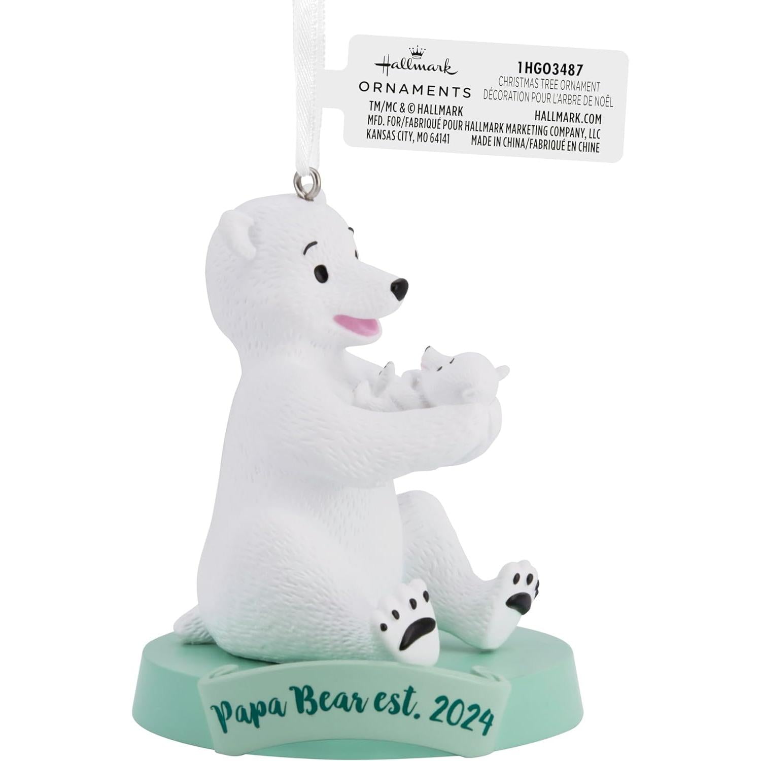 Celebrate the arrival of fatherhood with this heartwarming Papa Bear New Dad ornament from Hallmark’s New Baby collection. This endearing resin keepsake depicts a proud bear papa gently cradling his cub, atop a teal base engraved with “Papa Bear est. 2024.” Arriving mint in its original Keepsake box, it's a thoughtful gift for new fathers, making this holiday season extra meaningful.