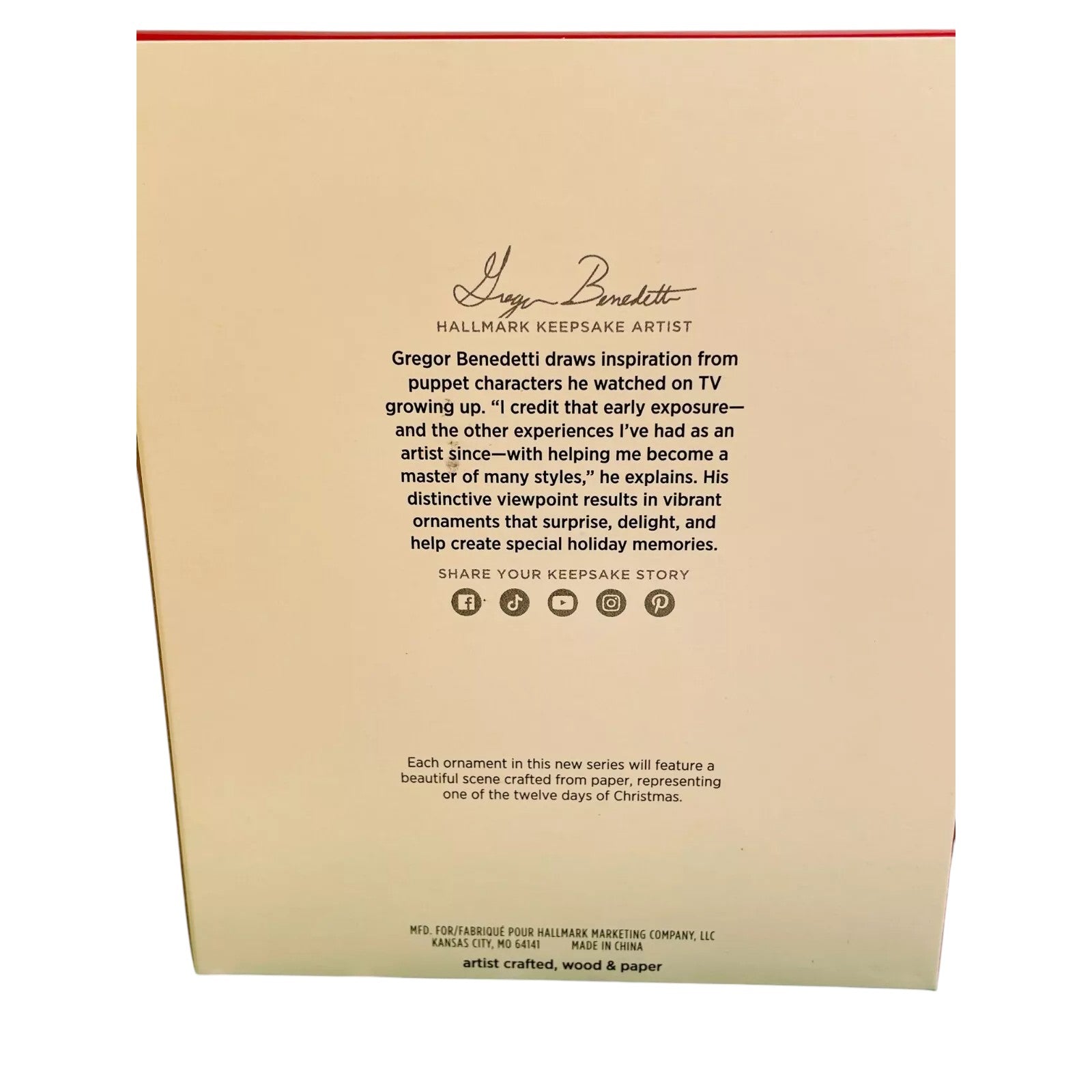 Celebrate the timeless charm of the classic carol with the 2024 Partridge in a Pear Tree Hallmark Keepsake Ornament. As the inaugural piece in the new Twelve Days of Christmas series, this ornament features a beautifully laser-cut wood frame showcasing an intricate papercraft scene of a partridge nestled among pear branches. The reverse side includes the verse: "On the first day of Christmas my true love gave to me... a partridge in a pear tree." Designed by artist Gregor Benedetti, this ornament is crafted from wood, paper, and plastic, and comes packaged in its original Hallmark gift box for easy gifting and storage.