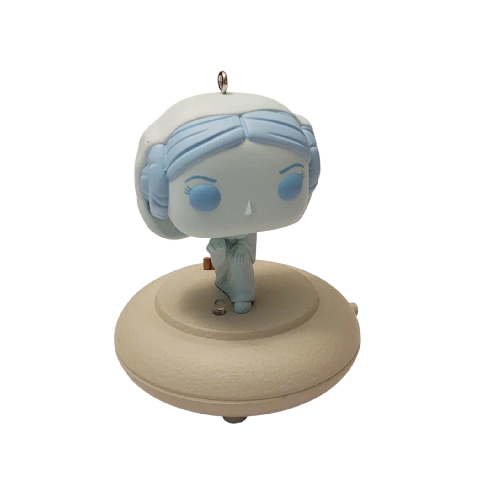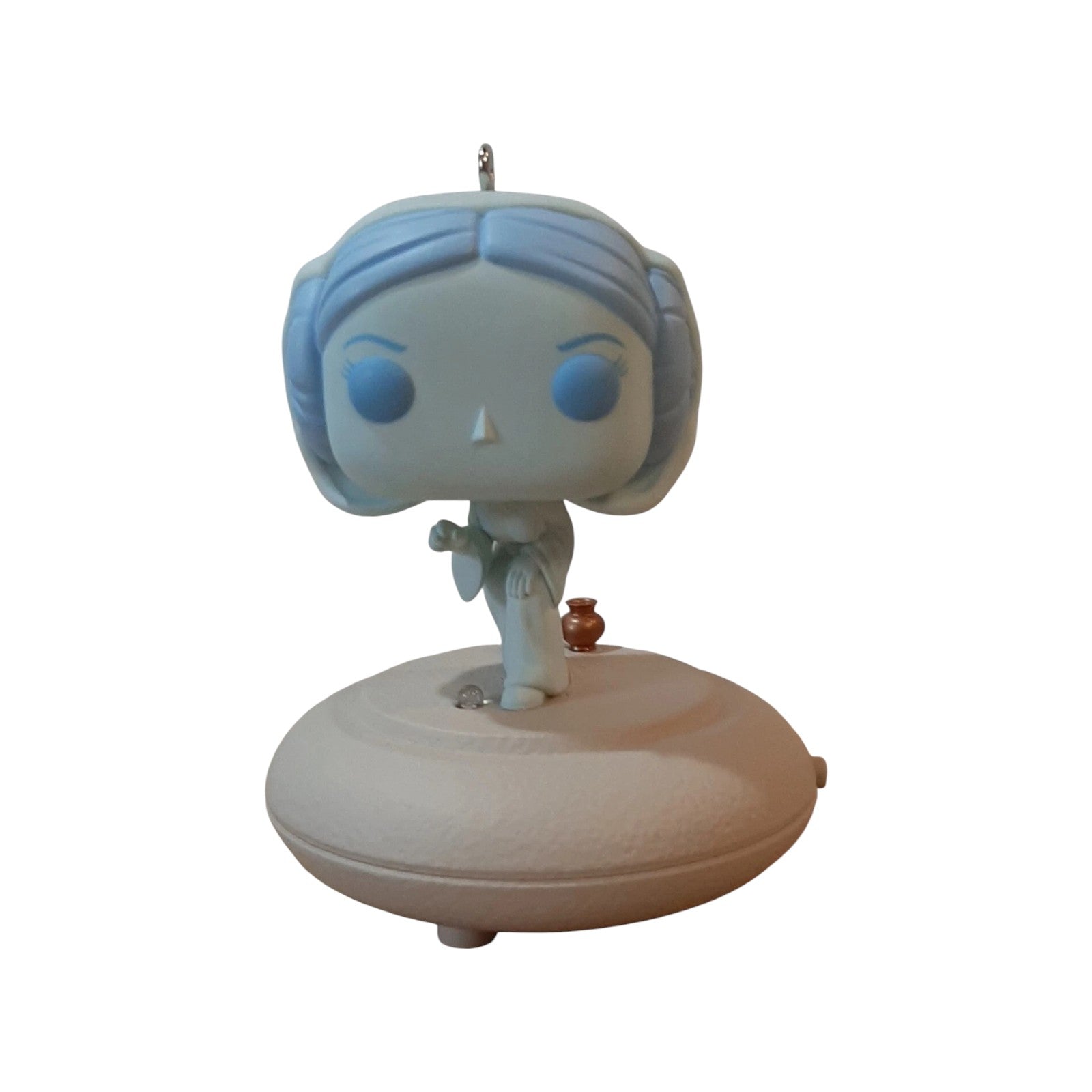 Immortalize one of cinema’s most iconic moments with this 2024 Hallmark Magic Light & Sound ornament styled in official Funko Pop! form. Princess Leia is depicted as a hologram, delivering her urgent plea for help from A New Hope. Press the built-in button to illuminate Leia and hear her heartfelt line, “Help me, Obi‑Wan Kenobi, you’re my only hope.” Crafted from high-quality plastic, the ornament includes three LR44 batteries (included) and comes pre-hung in its original box