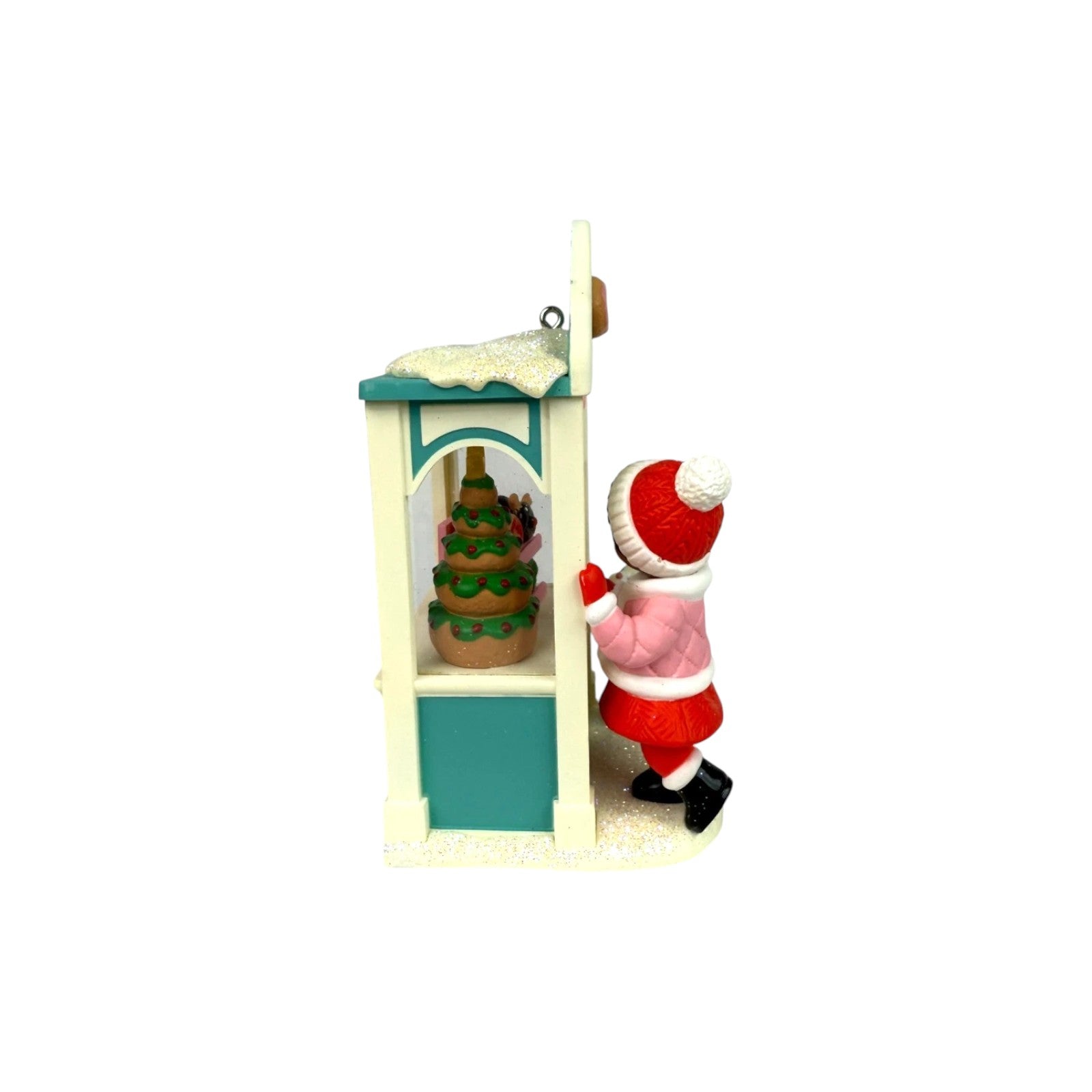 Delight in the festive charm of the 2024 Christmas Windows ornament, featuring "Rosie's Donut Shop." This exclusive Keepsake Ornament Club piece showcases a young girl and her cat gazing through a snowy window at a whimsical Christmas tree crafted from stacked donuts and pastries adorned with snowman and reindeer faces. Designed by artists Nina Aubé and Robert Hurlburt, this ornament is the 22nd in the beloved Christmas Windows series. It comes in its original gift box, making it a perfect addition to your holiday decor or a thoughtful gift for collectors.