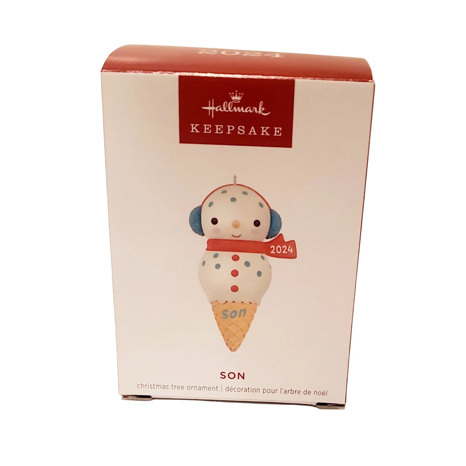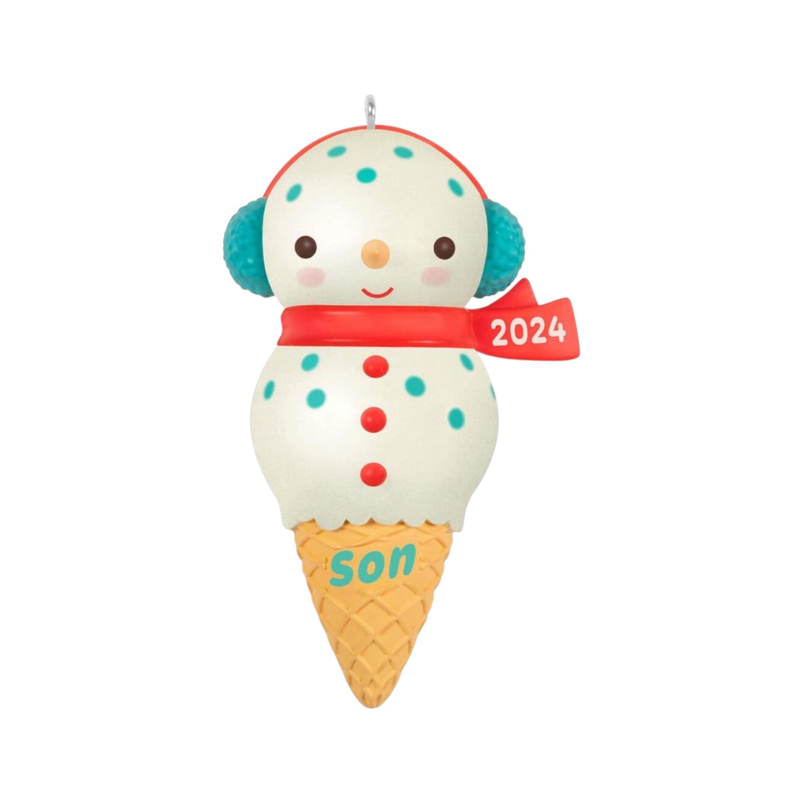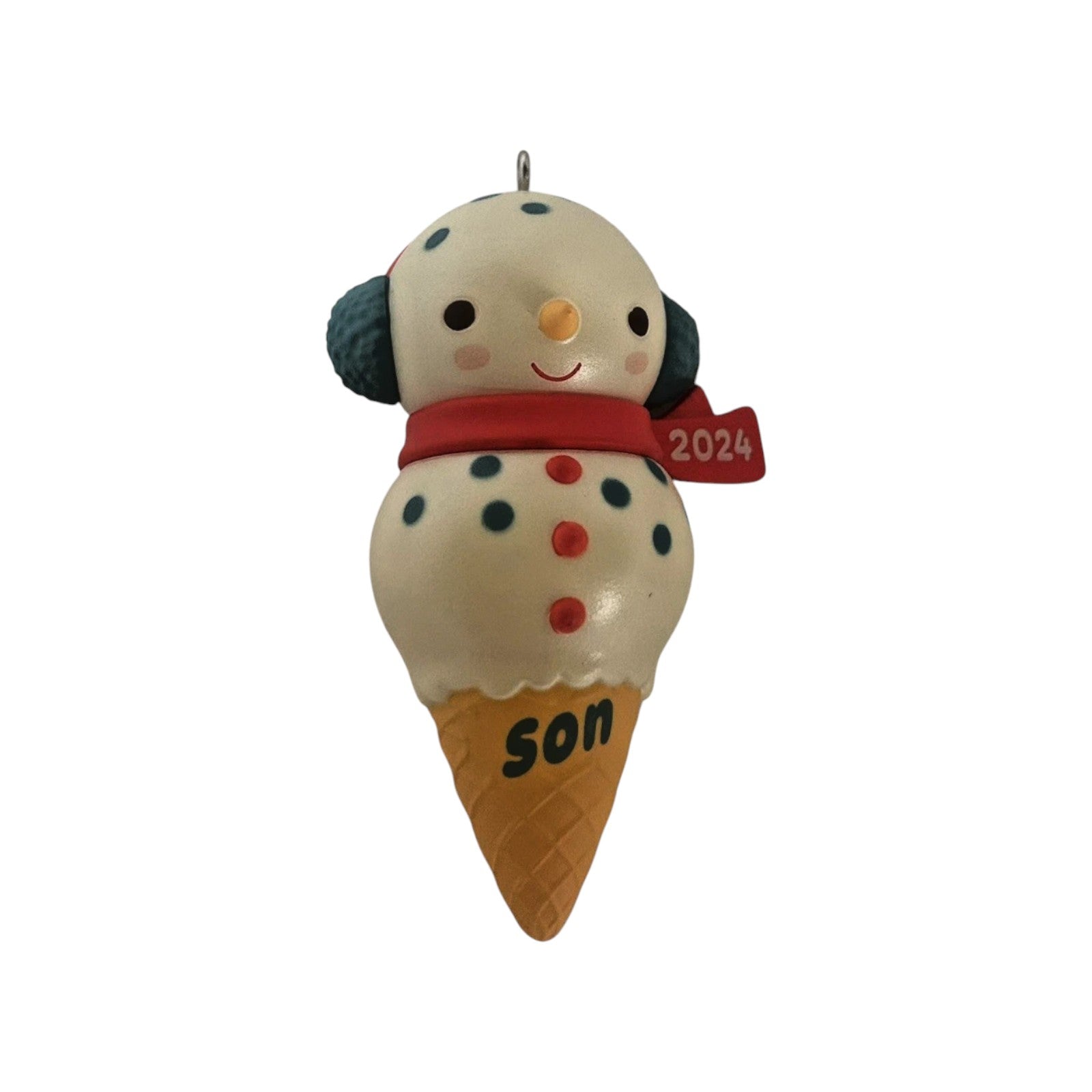 Celebrate your son's sweetness with the 2024 Son Hallmark Keepsake Ornament. This delightful decoration features a smiling snowman designed to resemble a festive ice cream cone, complete with a red scarf, blue earmuffs, and colorful buttons. The cone is inscribed with "Son," and the scarf is dated with "2024," making it a perfect keepsake for this year's holiday season. Crafted from durable plastic, this ornament measures approximately 1.85" W x 3.62" H x 1.53" D and comes packaged in its original gift box, ideal for gifting and storage.