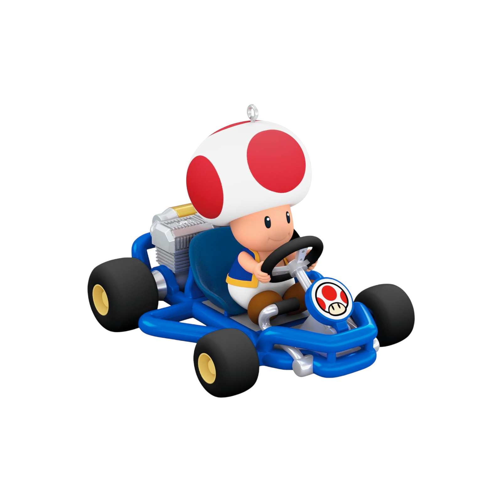 Race into holiday joy with 2024 Toad, Mario Kart (Nintendo), a vibrant Keepsake ornament featuring the beloved Mushroom Kingdom racer behind the wheel of his blue go-kart. This ornament captures Toad’s cheerful expression in full color, with turning wheels that add motion charm even when hanging on the tree.