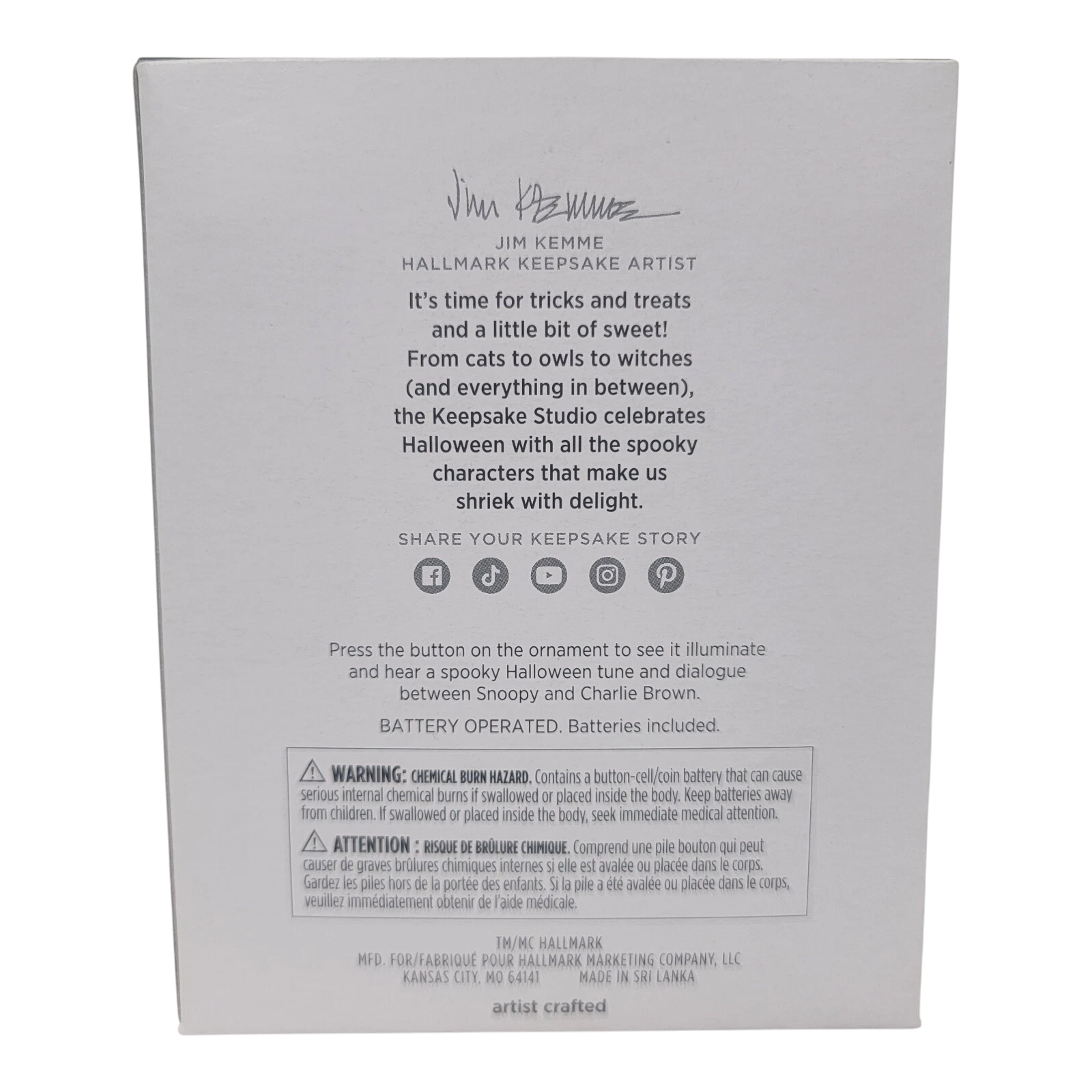 Charlie Brown and Snoopy team up for a light‑hearted Halloween adventure! This interactive keepsake features Charlie Brown holding a pumpkin-shaped candy bucket while Snoopy holds a flashlight, perfectly capturing their “trick-or-treating pals” moment. Press the button to illuminate Snoopy's face and enjoy playful spooky sounds, bringing a touch of magic without any cords—batteries (3 × LR44) are already included. Delivered brand-new in its original box with tags.