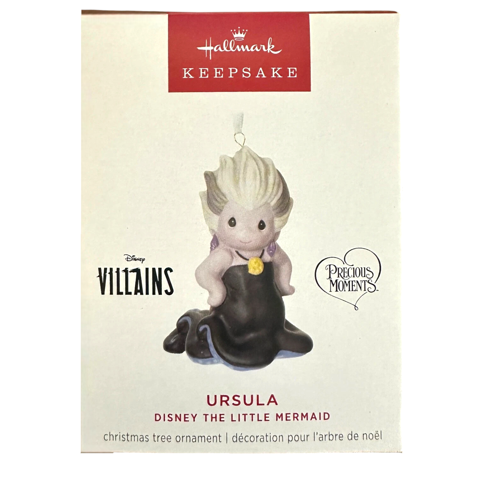 Dive into the depths of Disney magic with the 2024 Ursula Hallmark Keepsake Ornament. This limited-edition piece captures the iconic sea witch from The Little Mermaid in the beloved Precious Moments style. Crafted from premium porcelain, Ursula's signature tentacles and mischievous grin are rendered with charming detail. Measuring approximately 3" H x 2.25" W x 2" D, this ornament includes a hanger attachment and comes packaged in a collector's gift box, making it a perfect addition to any Disney Villains collection