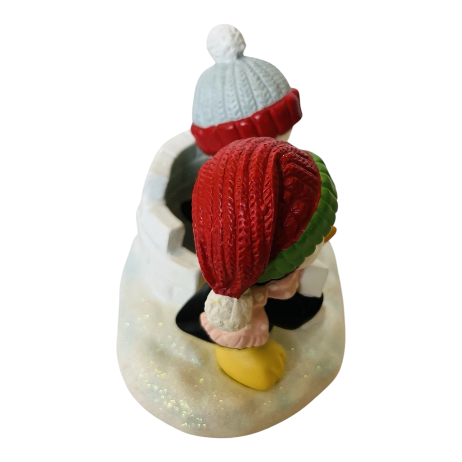 This adorable collectible features a pair of penguins working together to build an igloo — each one wearing snug hats and scarves, clearly enjoying the wintry teamwork. The charming sculpt is crafted in hand-painted resin, with fine detail in the icy blocks and festive accessories, making it a delightful holiday accent. It’s an uplifting tribute to partnership, friendship or shared effort — ideal for gifting a colleague, friend or “team-mate” at Christmastime. The figure stands approximately 4.75″ high, showcasing its presence even on a shelf or desk away from the tree.