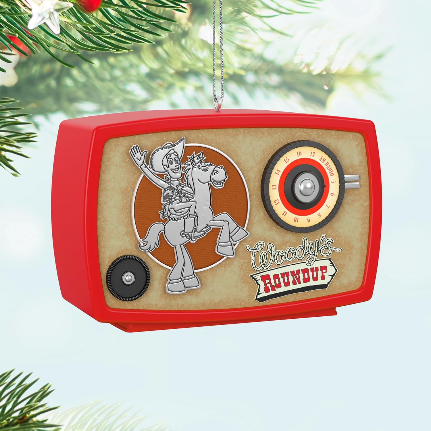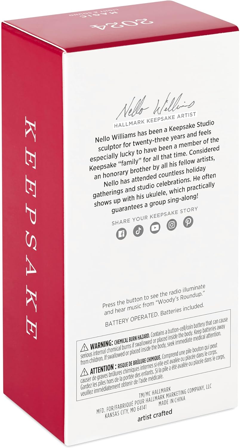 Tune in to classic Western char m with 2024 Woody’s Roundup Radio, a Magic – Light & Sound Keepsake ornament that brings the heart of Toy Story 2 to life. The design imitates a vintage radio set with a glowing dial and features Sheriff Woody atop his trusted steed Bullseye on the front. Press the button and the radio lights up while playing an instrumental version of the “Woody’s Roundup” theme song, offering a delightful, nostalgic audio-visual display.
