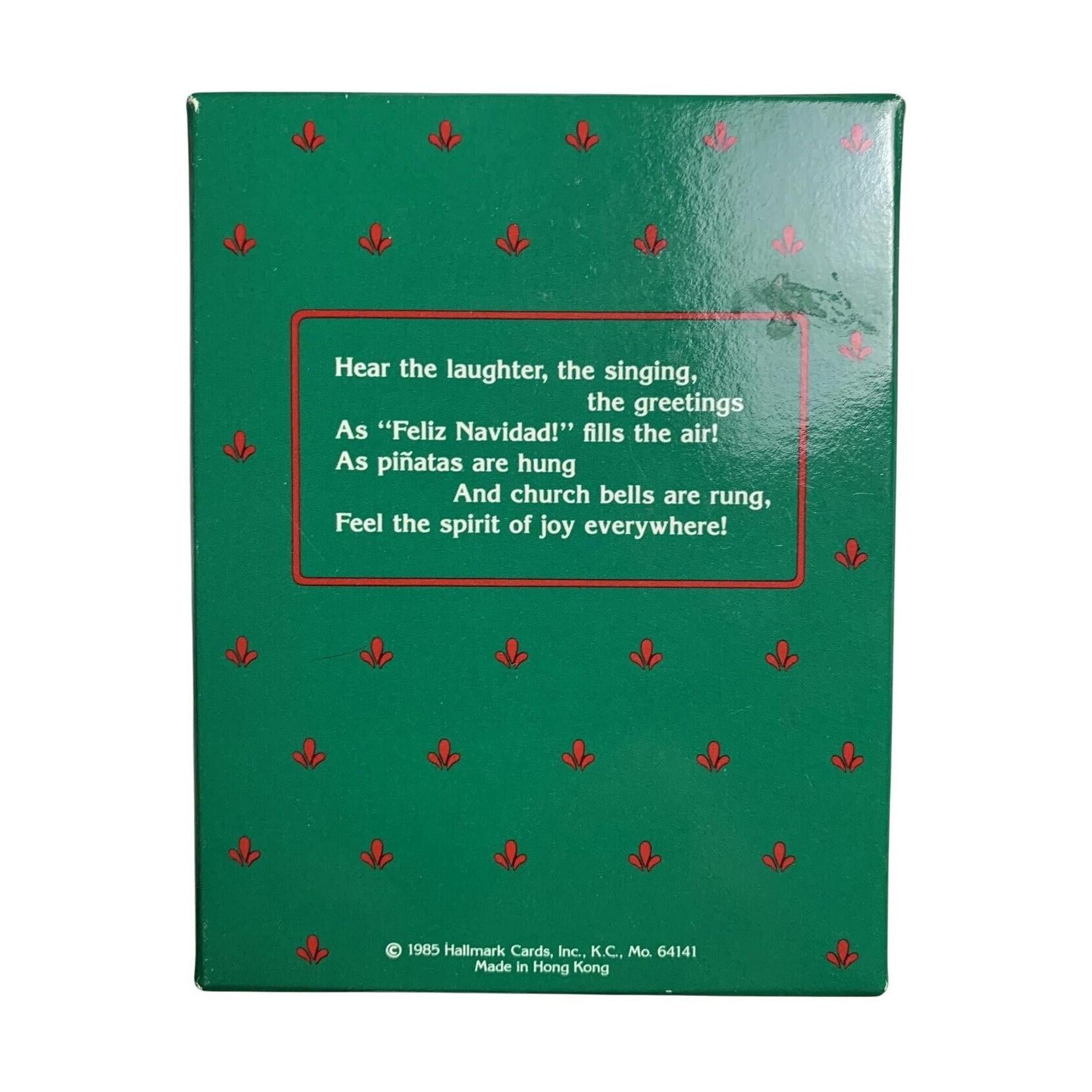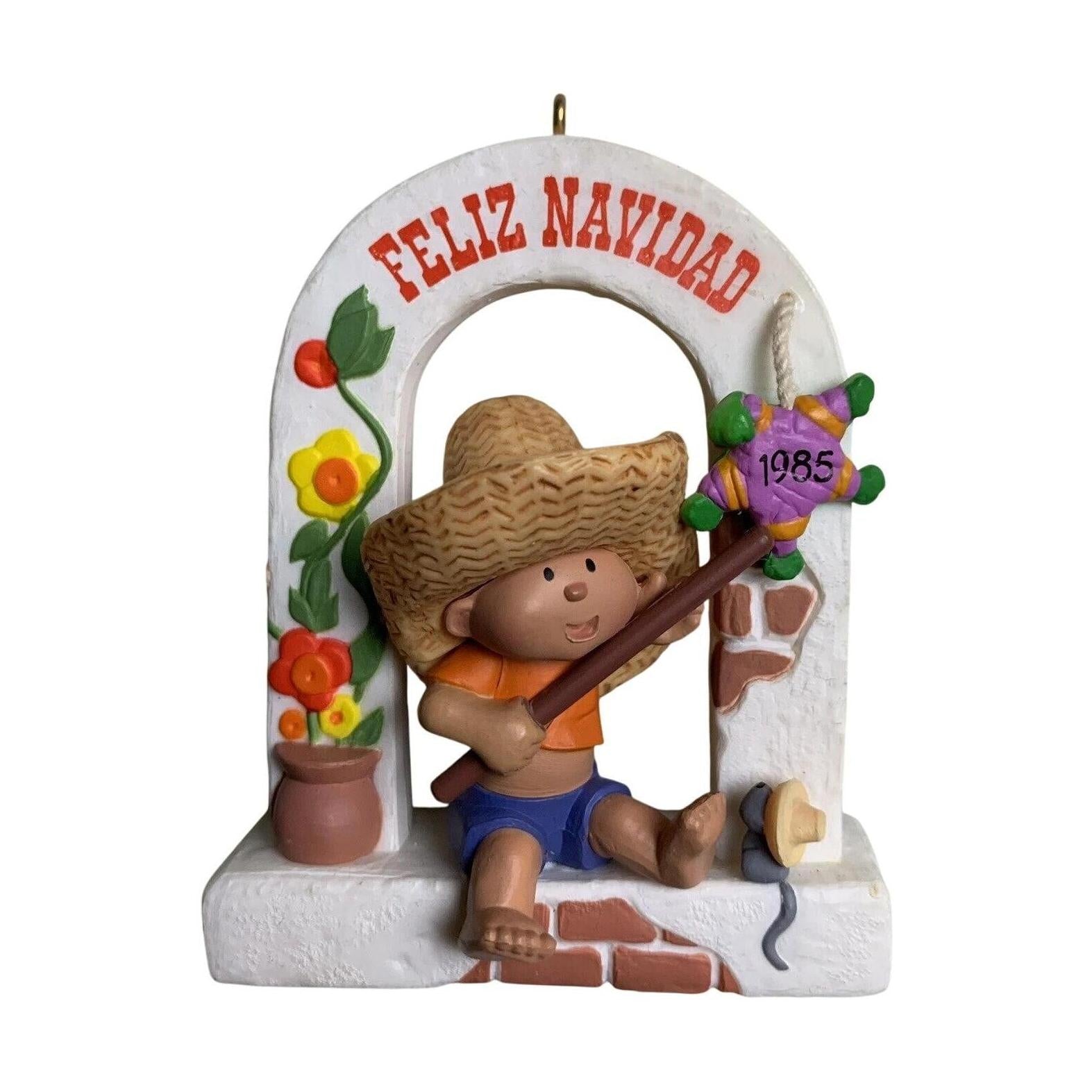 Celebrate global cheer with the 1985 Windows of the World – Mexico ornament— the first in the series, featuring a joyful child wearing a straw sombrero and cracking a piñata inscribed “1985” beneath a festive “Feliz Navidad” arch. A tiny mouse companion wearing its own mini hat peeks out beside the scene. Crafted in vivid detail with painted resin and sculpted ceramic, this hand-painted keepsake arrives in its original collector’s green velvet-lined box labeled Windows of the World – Mexico. No power needed—just vibrant cultural charm in miniature form.