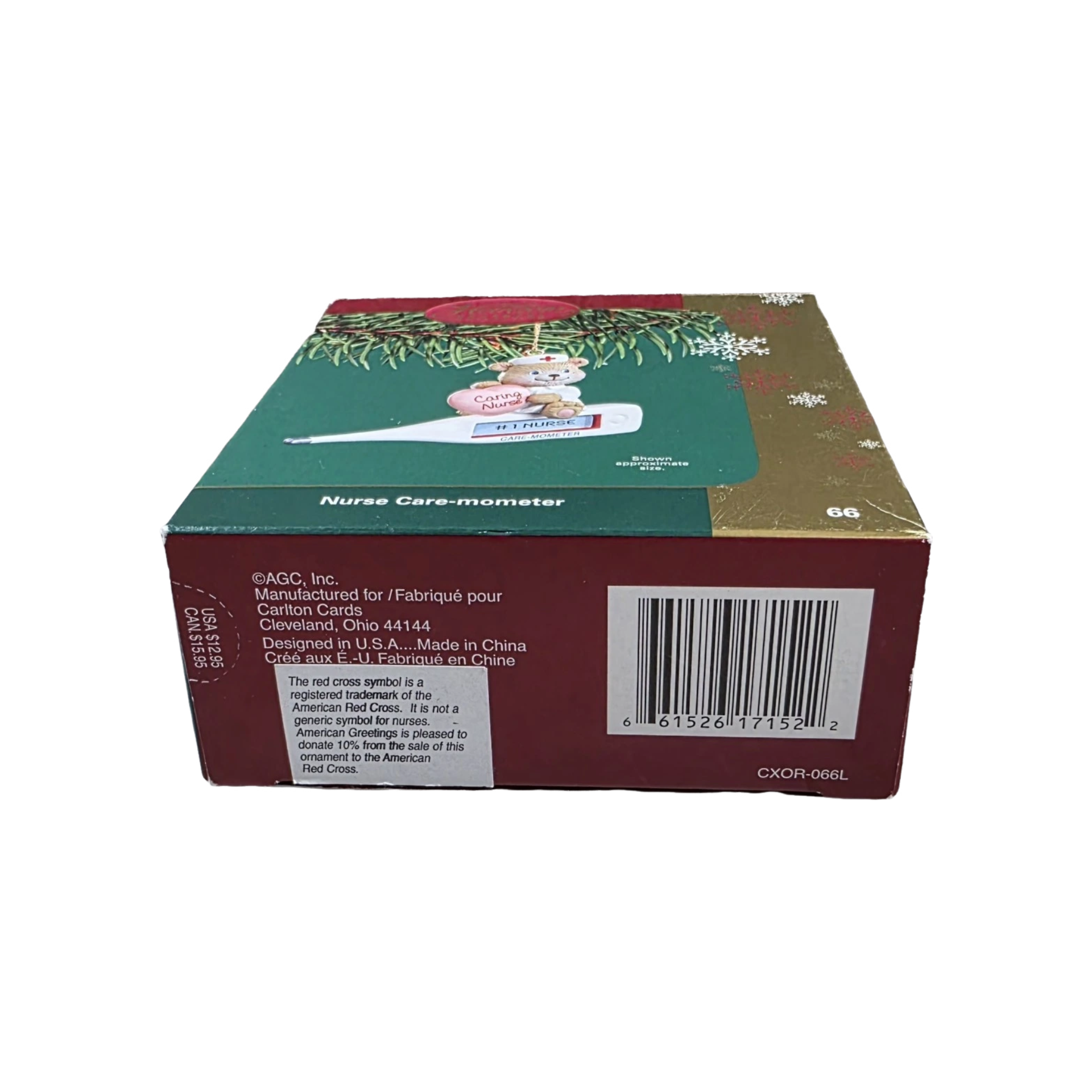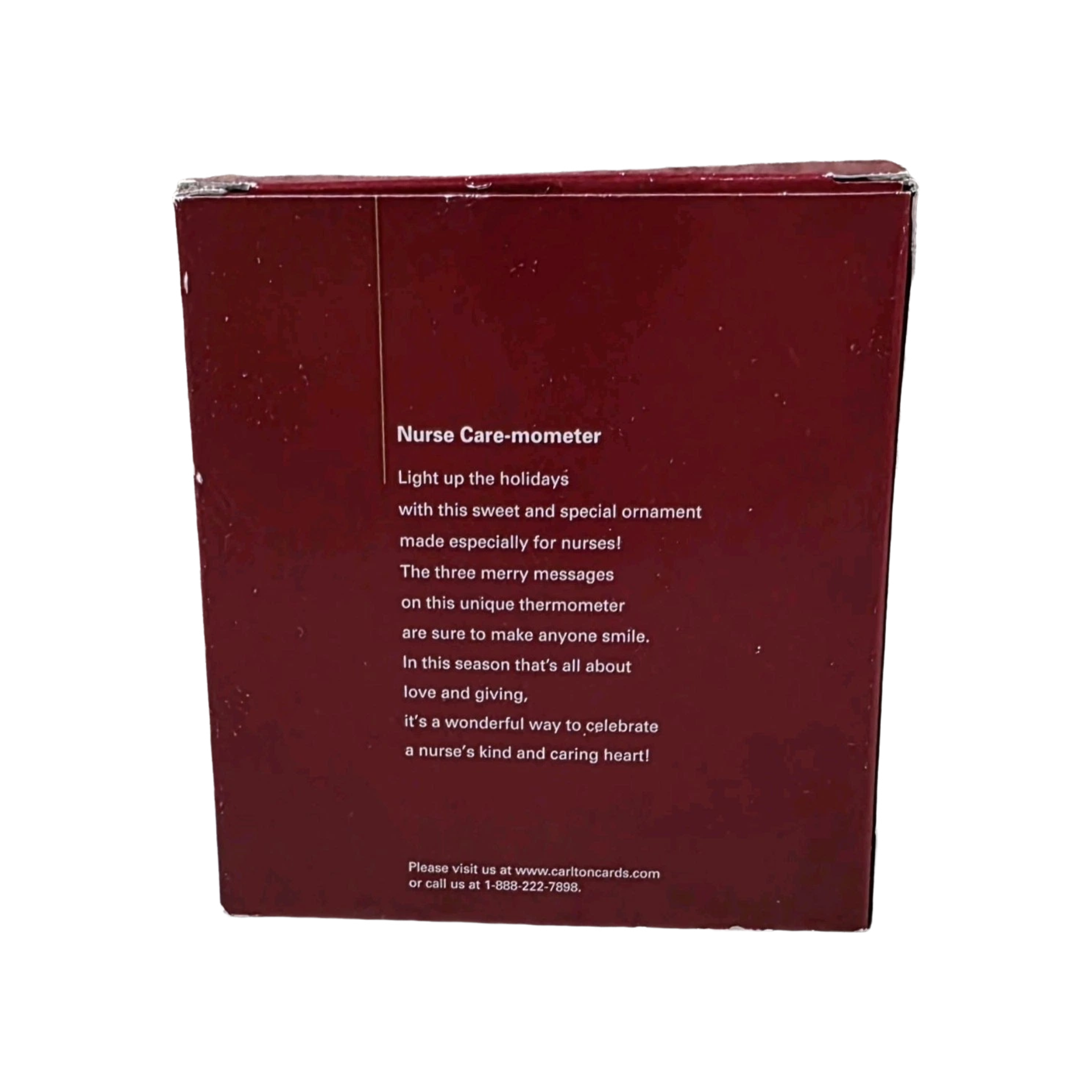 This 2004 Carlton Cards ornament celebrates the caring spirit of nurses through a playful, holiday-themed design. The ornament depicts a nurse holding a large “care-meter” gauge — a symbolic meter of care — representing compassion and dedication in a charming, collectible form. The package, when complete, includes the ornament itself, the hanging loop, and the original box with its inner packaging. This piece is purely decorative — there are no lights, sound, or motion — so No Power Needed.