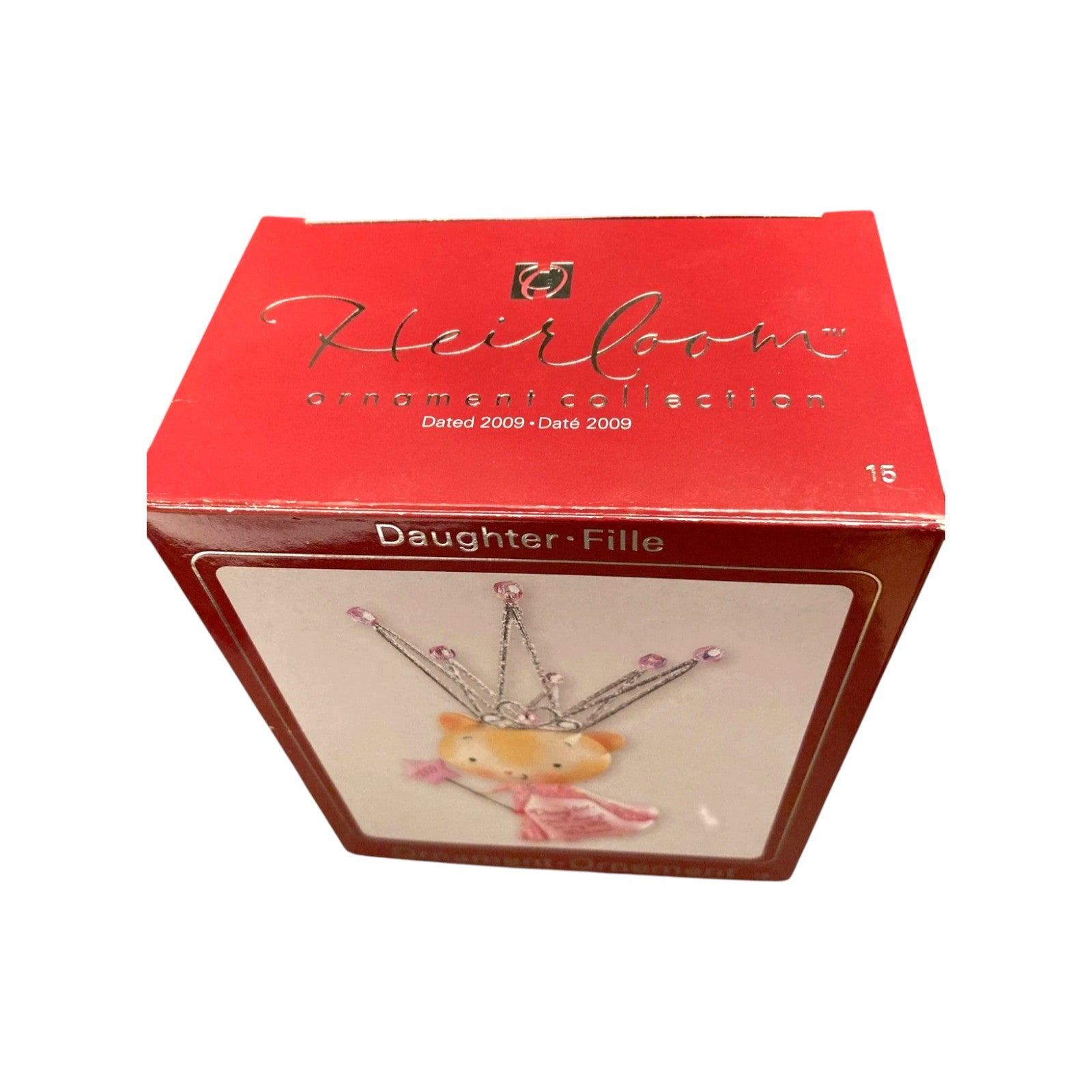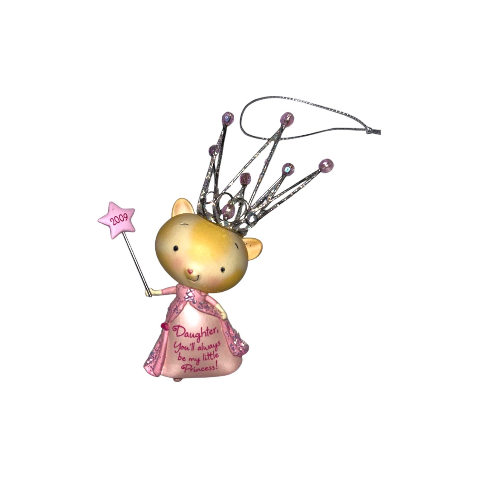 This 2009 Carlton Cards ornament celebrates a cherished daughter with a sweet princess-themed design. The ornament features an adorable kitten dressed in a pink glittered gown, holding a star wand dated 2009. She wears an elegant silver crown accented with pink jewel details and sparkling embellishments. The gown is inscribed with the heartfelt message, “Daughter, You’ll always be my little Princess!” Crafted from hand-painted resin with glitter accents and dimensional detailing, this ornament captures both whimsy and sentiment. It includes the original red Carlton Cards presentation box labeled “Daughter • Fille” with protective insert. This ornament does not include motion, sound, or lighting features and does not require batteries or cords.