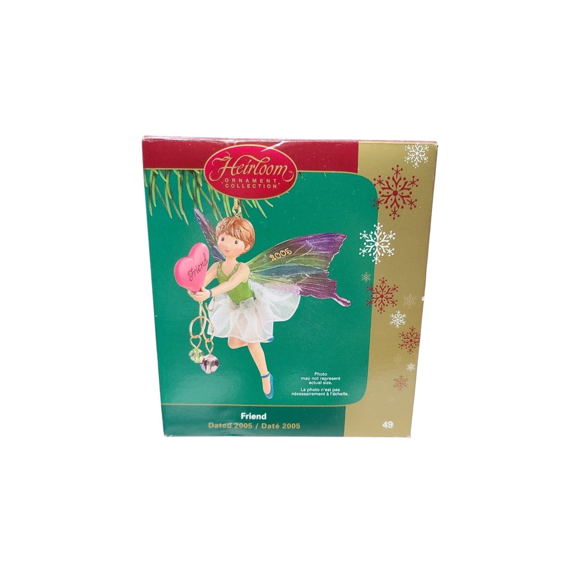 This Carlton Cards Friend (Friendship) ornament was released as part of the 2005 Heirloom Ornament Collection, often referenced as #49 Friend in seller listings. It features a festive motif celebrating friendship and holiday cheer — typically depicted with a whimsical design that appeals to collectors of sentimental and Heirloom holiday pieces. The ornament is crafted from molded materials with painted detail and includes a hanging loop for display. It generally comes with its original box and tag when available, making it a meaningful collectible for Christmas décor or as a friendship gift. The piece is purely decorative and does not require batteries, cords, lights, or any power accessories.