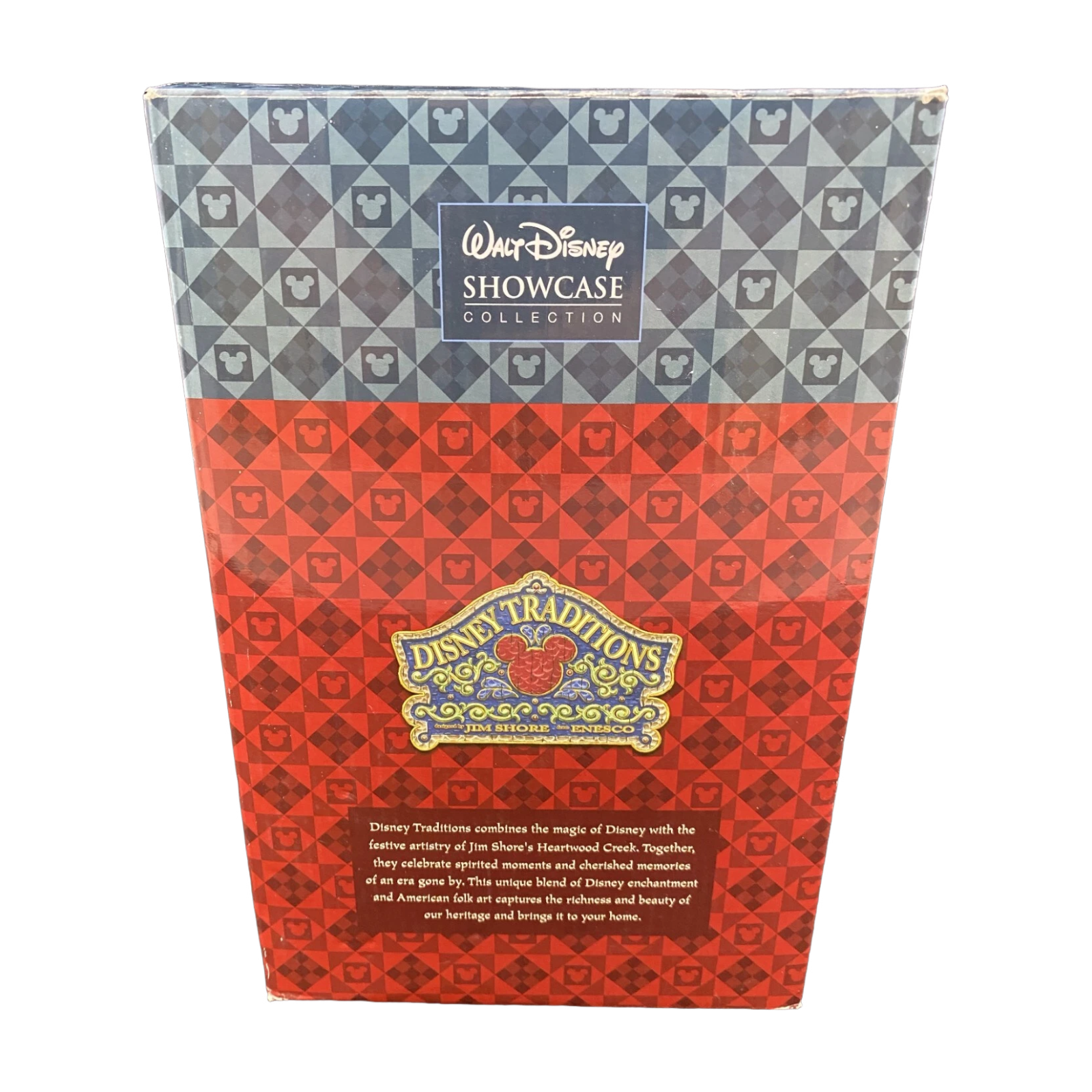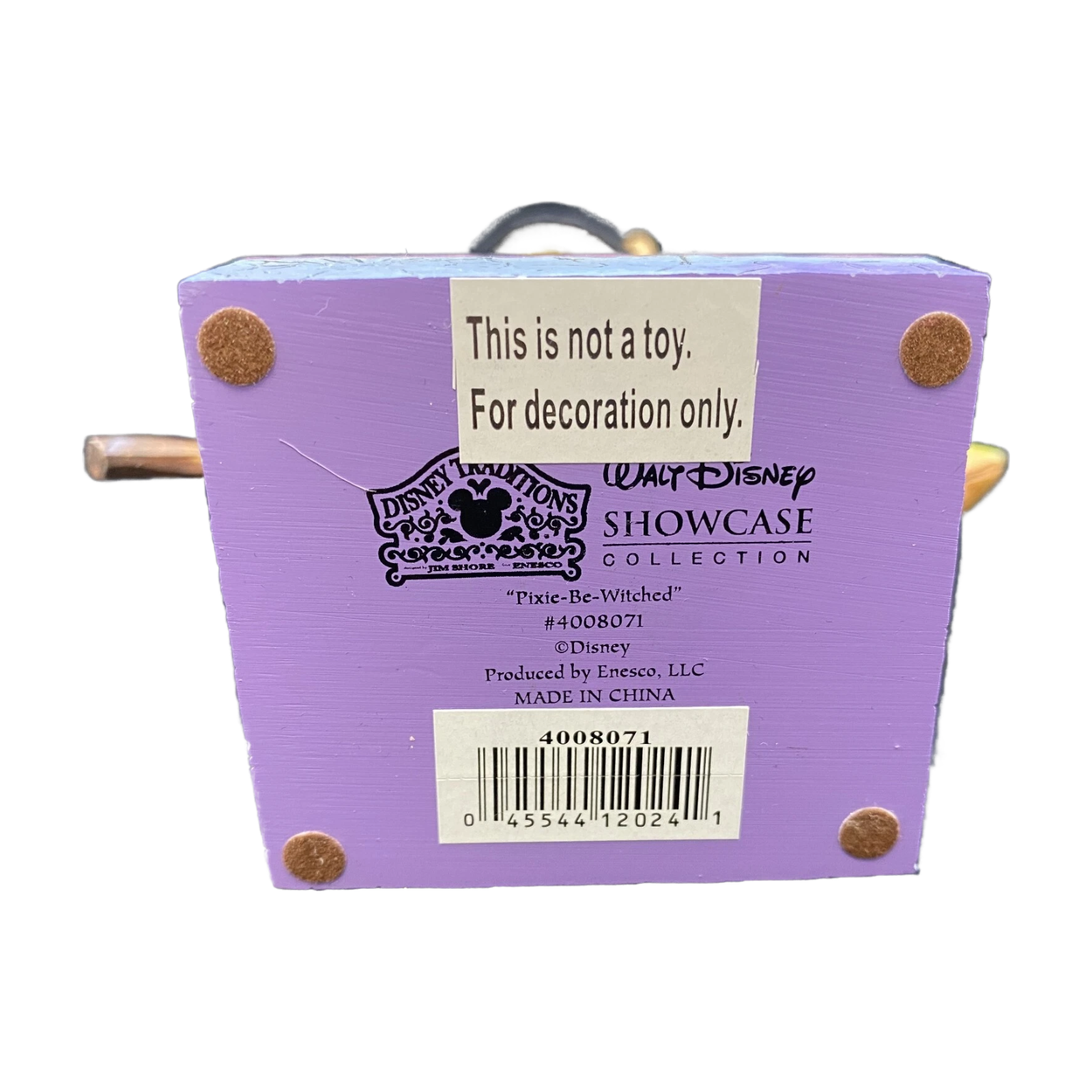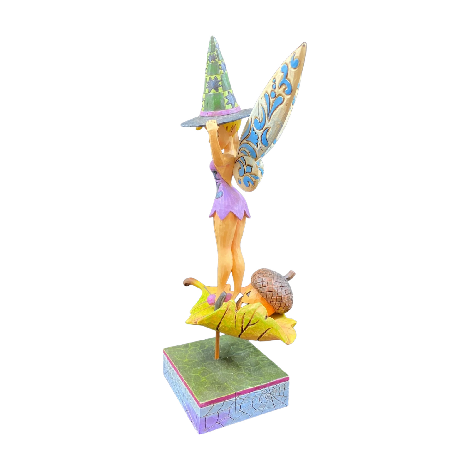 This whimsical figurine from the Jim Shore “Disney Traditions / Disney Showcase” line for Enesco captures Tinker Bell in a playful autumn/Halloween-themed pose, titled Pixie Be-Witched. (Item number 4008071.) The design shows Tinker Bell draped in a swirling leaf-patterned dress, perched atop a pumpkin base and accented with fall colors—bright greens, oranges, purples—and fine folk-art detailing typical of Jim Shore’s style. According to listings, this piece belongs to the Showcase collection and was introduced around 2007.