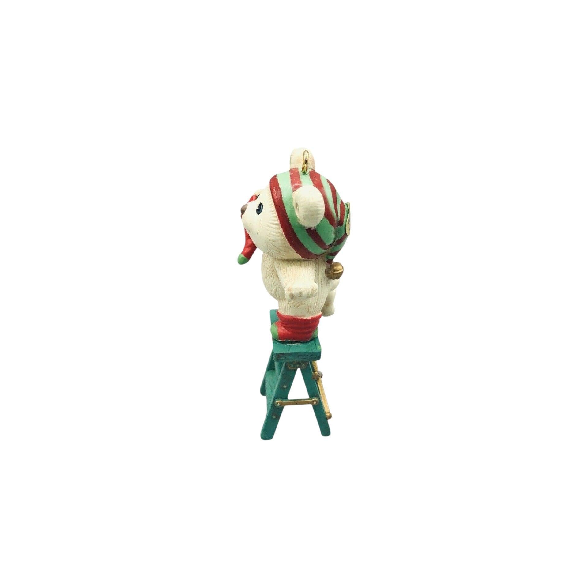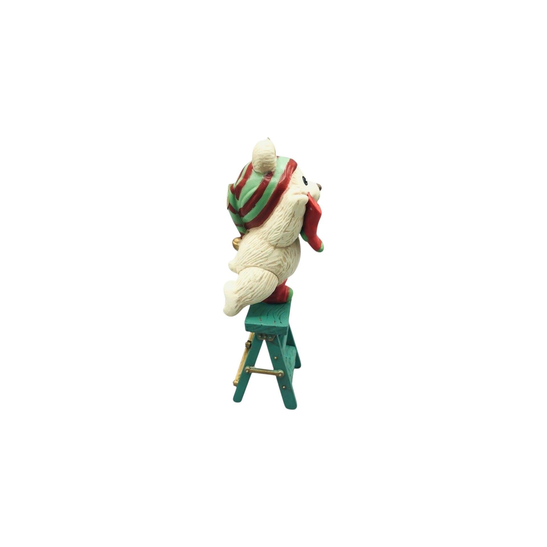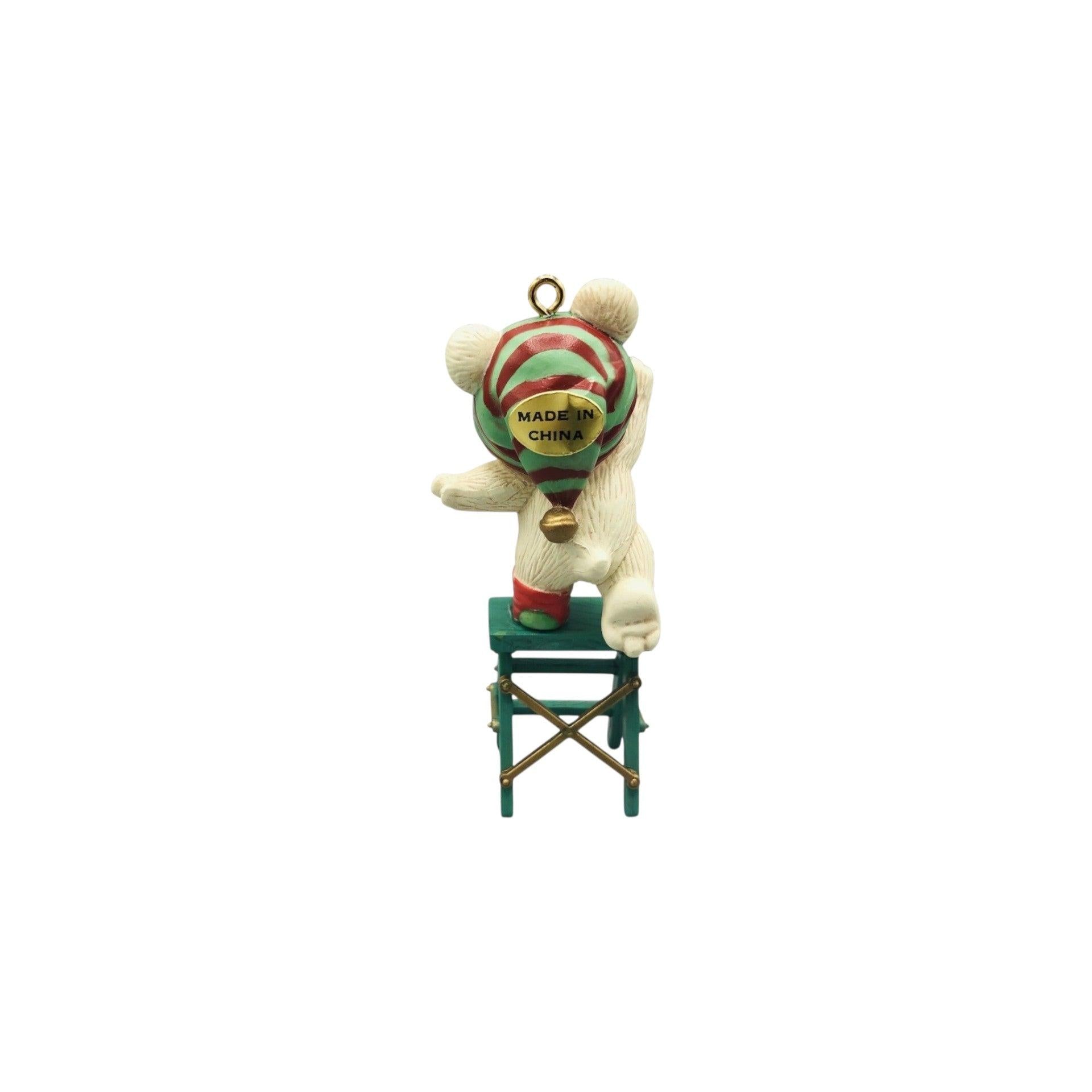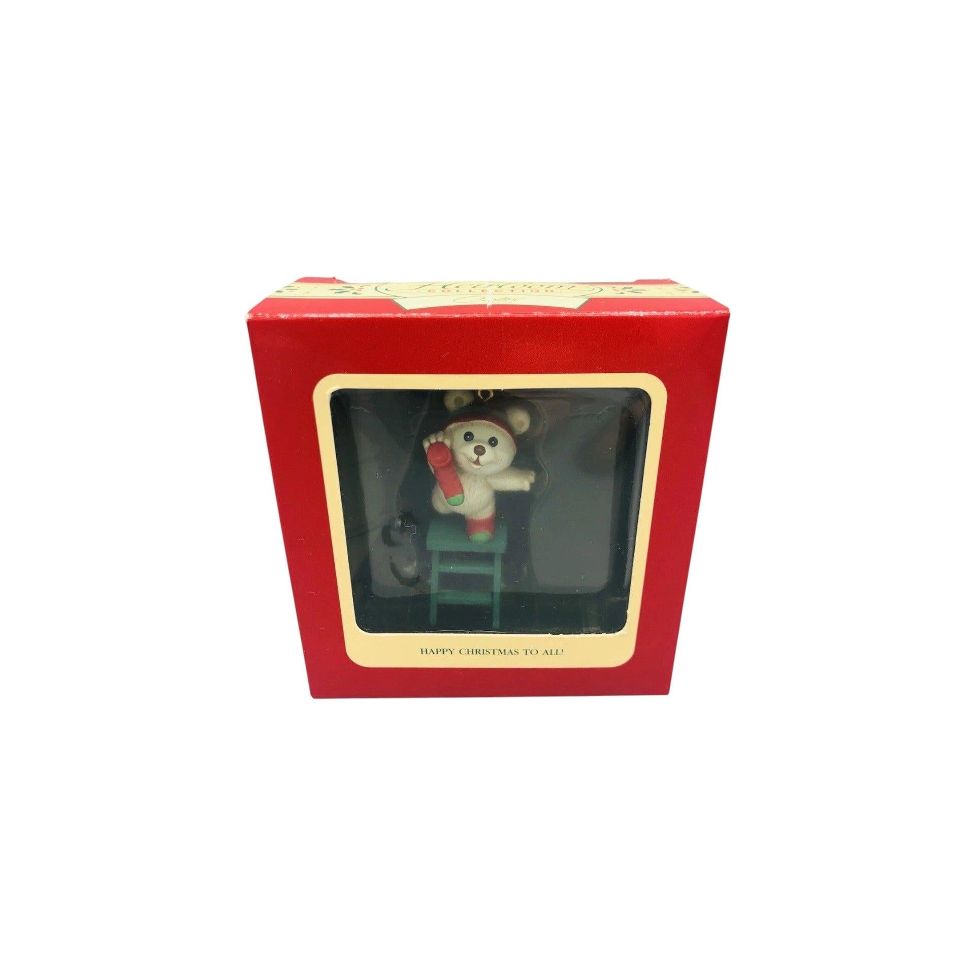 This classic Carlton Cards Happy Christmas To All Bear ornament was released in 1990 as part of the Heirloom Collection and showcases a cheerful holiday bear holding or standing next to Christmas elements such as a stocking. The bear has a multicolored, hand-painted finish and captures the festive spirit of the season. The original Carlton Cards packaging may include the ornament and box (often with tag), making it appealing for vintage collectors. This decorative ornament is designed for hanging on a Christmas tree and does not require batteries, power cords, lights, or any accessories to function.